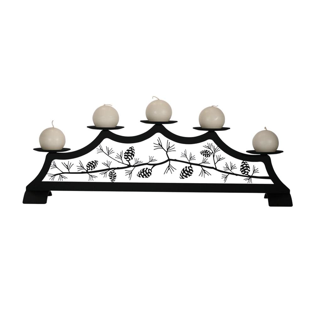 Wrought Iron Pine Cone Fireplace Pillar :: Candles not included Candle light adds a romantic feel and pines cones are fun. The pine cone has been used as a symbol for generosity and merriment for centuries. The mythological Greek god Dionysus carried a pine cone staff. Now pine cones have become a symbol for the holidays and joyous times. You can blend the warmth of the fireplace, the romance of candle light and the playfulness of pine cones with the Wrought Iron Pine Cone Fireplace Pillar. This pine cone candle holder features a branch from a pine tree delicately covered with pine needles and pine cones. The artists created this beautiful wrought iron fireplace pillar which holds 5 candles on a scalloped arch. The hand crafted pine candle holder has a powder black iron finish and is made in the USA. This is a gift which will be remembered and enjoyed for years to come. Order one for yourself and one for a house warming or holiday gift. Look for other pine cone and pine tree themed decor on this site. Add joy and romance with the Wrought Iron Pine Cone Fireplace Pillar. PRODUCT SPECIFICATIONS Item Height: 8.5 In. Item Width: 8 In. Item Length: 28 In. Product Weight: 84 oz Color: flat black Packaging: Product is sold Individually (you are purchasing one item) Material: wrought iron containing alloys of .01% to .29% carbon and iron Finish: Hand crafted wrought iron for indoor or outdoor use. (heavy duty metal) in a flat powder coating finish :: lead free, long lasting & rust resistant Country: MADE in the USA :: Supporting United States craftsman.