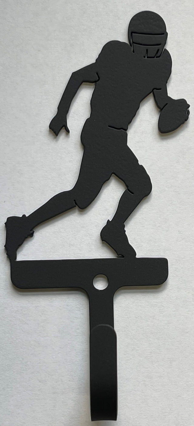 Wrought Iron Football Player Decorative Wall Hook Sm :: 1.25 Inch Opening Hook Depth (dimension extending out from wall to end of the curve) Our hooks can safely hold up to 10 lbs. of weight when mounted to a secure surface. It is easily to fill up your home with trinkets and ornaments. Soon you may discover you have no room left! Perhaps your home only offers so much wall space to begin with. Either way, this small wall hook is just the thing to add to your wall decor without taking up too much valuable space! The look is perfect for any sport theme. Hang your belongings on the handy hook that extends from the bottom of this unique wrought iron ornament. The single piece design features a strong hook that is perfect to hang just about anything. The top is shaped to look like Football Player running with the ball. Mounting screws are included and will secure this attractive black wrought iron hook to your wall at the hook’s center. Get more hanging options in a single small wall hook! This Football Player hook is perfect for any home decor, especially a den or for anyone who has a love for football. PRODUCT SPECIFICATIONS Item Height: 5 In. Item Width: 1.25 In. Item Length: 2.38 In. Product Weight: 2 oz Color: flat black Packaging: Product is sold Individually (you are purchasing one item) Material: wrought iron containing alloys of .01% to .29% carbon and iron Finish: Hand crafted wrought iron for indoor or outdoor use. (heavy duty metal) in a flat powder coating finish :: lead free, long lasting & rust resistant Country: MADE in the USA :: Supporting United States craftsman.