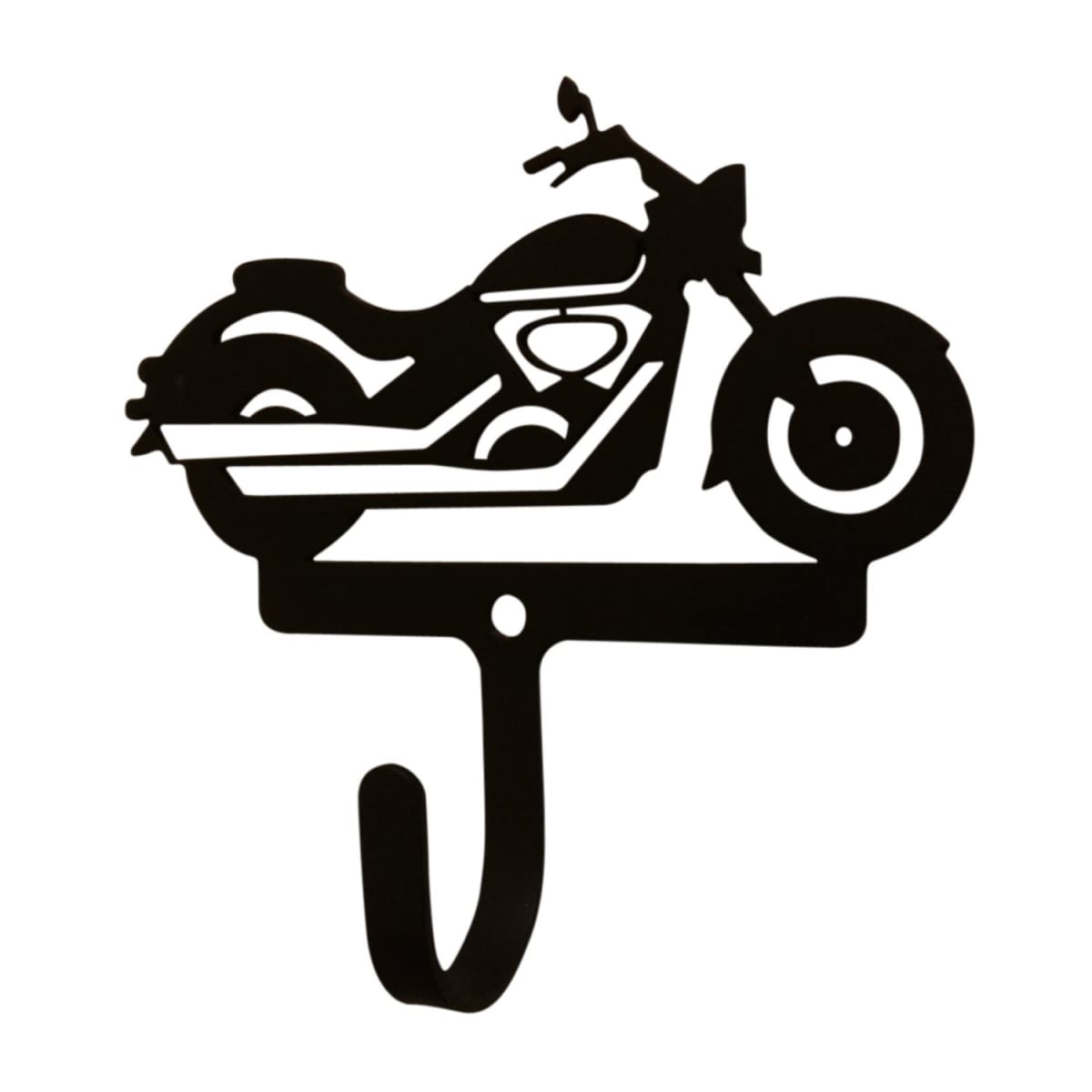 Wrought Iron Motorcycle Cruiser Decorative Wall Hook Small :: 1.25 Inch Opening Hook Depth (dimension extending out from wall to end of the curve) Our hooks can safely hold up to 10 lbs. of weight when mounted to a secure surface. It is easily to fill up your home with trinkets and ornaments. This small wall hook is just the thing to add to your wall decor without taking up too much valuable space! The look is perfect for any motorcycle enthusiast. Hang your belongings on the handy hook that extends from the bottom of this unique wrought iron ornament. The single piece design features a strong hook that is perfect to hang just about anything. A silhouette of a Cruiser style Motorcycle with cutout design from the top, ready to guide the way for unseen adventures! Mounting screws are included and will secure this attractive black wrought iron hook to your wall at the hook’s center. Get more hanging options in a single small wall hook! This stylish cruiser motorcycle hook is perfect for any home or garage and for anyone who has a fondness for road trips. Small 4.25 In. W x 4 In. H x 1.25 In. D Inside Hook Depth 1 In. PRODUCT SPECIFICATIONS Item Height: 4 In. Item Width: 1 1/4 In. Item Length: 4 1/4 In. Product Weight: 3 oz Color: flat black Packaging: Product is sold Individually (you are purchasing one item) Material: wrought iron containing alloys of .01% to .29% carbon and iron Finish: Hand crafted wrought iron for indoor or outdoor use. (heavy duty metal) in a flat powder coating finish :: lead free, long lasting & rust resistant Country: MADE in the USA :: Supporting United States craftsman.