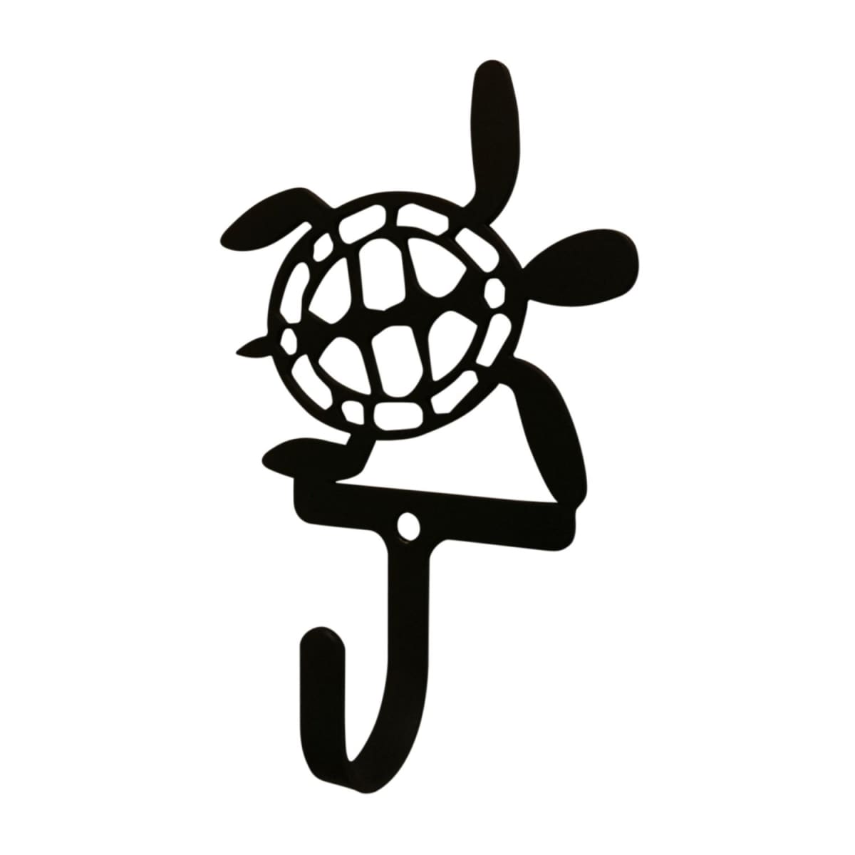 Wrought Iron Sea Turtle Decorative Wall Hook Small :: 1.25 Inch Opening Hook Depth (dimension extending out from wall to end of the curve) Our hooks can safely hold up to 10 lbs. of weight when mounted to a secure surface. This little black hook offers practicality as well as an attractive appearance! Any ocean themed room is not complete without this swimming sea turtle hook. The design is eye-catching and comes with sturdy black wrought iron construction. That means it will support even heavier items! Need a place to hang your wet towels, robes, or wreaths? This is the perfect wrought iron hook that will enhance your unique natures motif. The hook is adorned with an artistic sea turtle swimming in the deep blue sea. This useful item comes ready to hang with its own mounting screws. Buy a few to dress up your home or purchase as a gift. Each wrought iron sea turtle hook is carefully crafted in the United States for maximum quality. Find even more uses for these handy hooks. They make for wonderful ornament or key hangers. The possibilities are endless: Small 3 In. W x 4.5 In. H x 1.25 In. D Inside Hook Depth 1 In. PRODUCT SPECIFICATIONS Item Height: 4 1/2 In. Item Width: 1 1/4 In. Item Length: 3 In. Product Weight: 3 oz Color: flat black Packaging: Product is sold Individually (you are purchasing one item) Material: wrought iron containing alloys of .01% to .29% carbon and iron Finish: Hand crafted wrought iron for indoor or outdoor use. (heavy duty metal) in a flat powder coating finish :: lead free, long lasting & rust resistant Country: MADE in the USA :: Supporting United States craftsman.