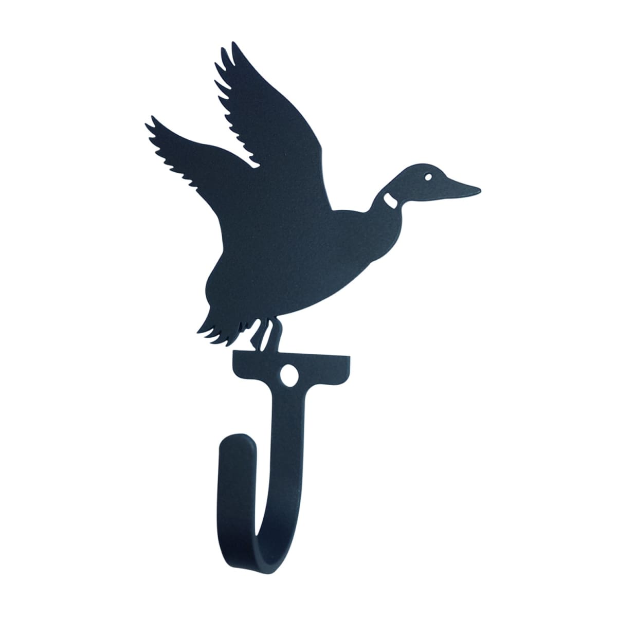 Wrought Iron Duck Decorative Wall Hook Small :: 1.25 Inch Opening Hook Depth (dimension extending out from wall to end of the curve) Our hooks can safely hold up to 10 lbs. of weight when mounted to a secure surface. This little black hook offers practicality as well as an attractive appearance! Any nature or hunting themed room is not complete without this duck hook. The design is eye-catching and comes with sturdy black wrought iron construction. That means it will support even heavier items! Need a place to hang your sweatshirts, bags, or hunting apparel? This is the perfect wrought iron hook that will enhance your unique natures motif. The hook is adorned with a mallard duck with its wing spread and ready to take flight. This useful item comes ready to hang with its own mounting screws. Buy a few to dress up your home or purchase as a gift. Each wrought iron duck hook is carefully crafted in the United States for maximum quality. Find even more uses for these handy hooks. They make for wonderful ornament or key hangers.: Small 3.25 In. W x 3.5 In. H x 1.25 In. D Inside Hook Depth 1 In. PRODUCT SPECIFICATIONS Item Height: 4 1/2 In. Item Width: 1 1/4 In. Item Length: 3 1/4 In. Product Weight: 3 oz Color: flat black Packaging: Product is sold Individually (you are purchasing one item) Material: wrought iron containing alloys of .01% to .29% carbon and iron Finish: Hand crafted wrought iron for indoor or outdoor use. (heavy duty metal) in a flat powder coating finish :: lead free, long lasting & rust resistant Country: MADE in the USA :: Supporting United States craftsman.