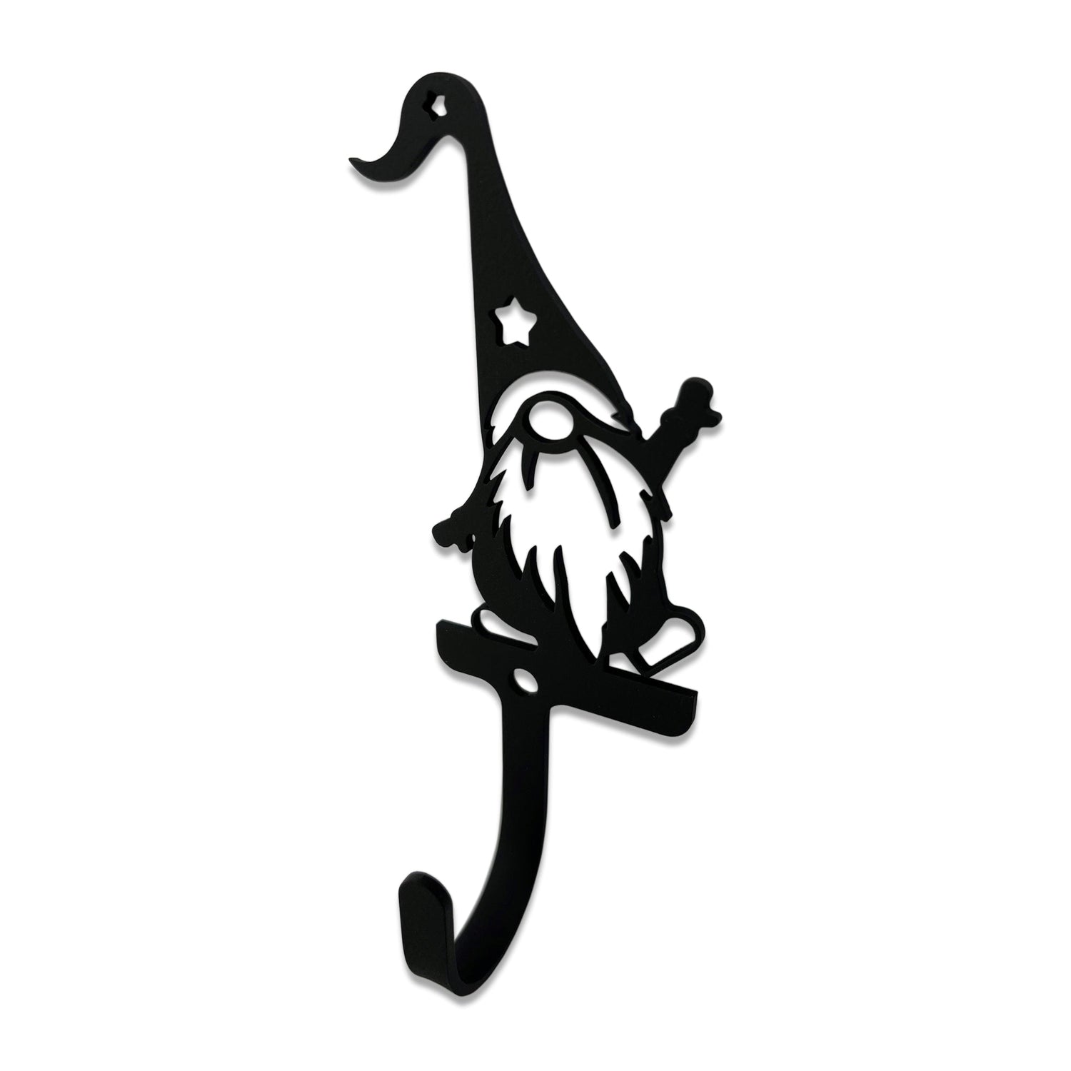 Wrought Iron Magical Garden Gnome Wall Hook Decorative Small:: 1.25 Inch Opening Hook Depth (dimension extending out from wall to end of the curve) Our hooks can safely hold up to 10 lbs. of weight when mounted to a secure surface. This wall hook is truly unique and will really be a great addition to any room in your home. It is fun and yet elegant so no matter what style home you may have, there is a perfect spot for this little salamander. The Garden Gnome is a very unique being and one that is easily recognizable and loved. This Garden gnome's hand extends up waving and welcoming There is nothing that this little gnome cannot handle and he will be glad to be such a help. This decorative wall hook is completely made out of wrought iron and is done in a powder black finish in order to create a beautiful and stunning silhouette against any wall. After wall with something this adorable and unique, you really want it to stand out. This product is also completely handmade in the USA so you can be sure that it is of the best quality and will last for years to come. This hook measures 5 inches high with a hook opening depth of 1 ¼ inches, so it is just the perfect size for that small corner or small wall section. PRODUCT SPECIFICATIONS Item Height: 5 In. Item Width: 1 1/4 In. Item Length: 2 1/8 In. Product Weight: 2 oz Color: flat black Packaging: Product is sold Individually (you are purchasing one item) Material: wrought iron containing alloys of .01% to .29% carbon and iron Finish: Hand crafted wrought iron for indoor or outdoor use. (heavy duty metal) in a flat powder coating finish :: lead free, long lasting & rust resistant Country: MADE in the USA :: Supporting United States craftsman.