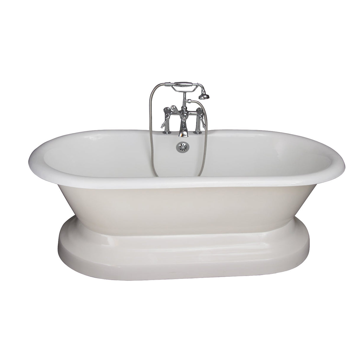 This striking cast iron double roll top tub rests on a decorative base. Elegant tub filler features elephant spout and hand shower. All necessary accessories are provided to install your tub to ensure a perfect bathing experience.