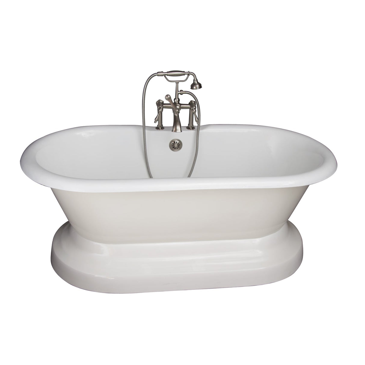This striking cast iron double roll top tub rests on a decorative base. Elegant tub filler features elephant spout and hand shower. All necessary accessories are provided to install your tub to ensure a perfect bathing experience.