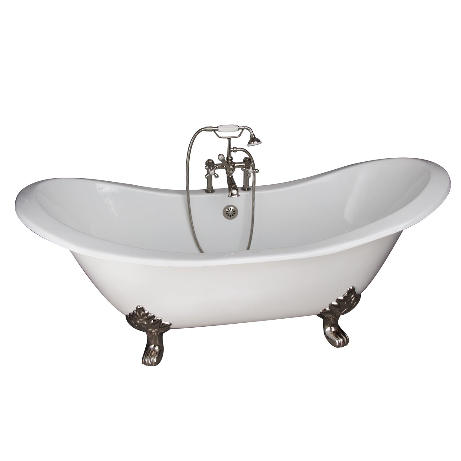 Luxuriate in this spacious cast iron double slipper tub with lion paw feet. Elegant tub filler features elephant spout and hand shower. All necessary accessories are provided to install your tub to ensure a perfect bathing experience.