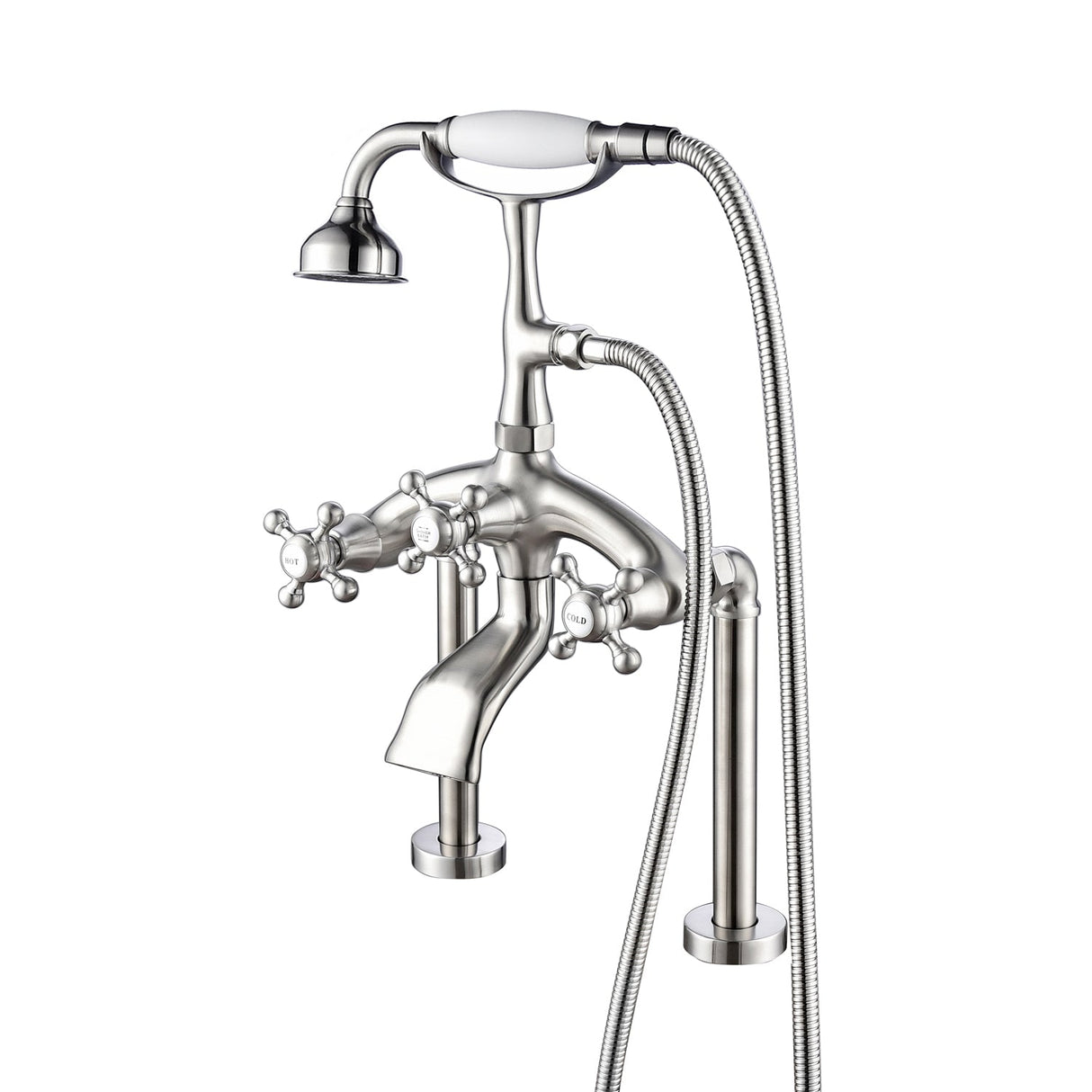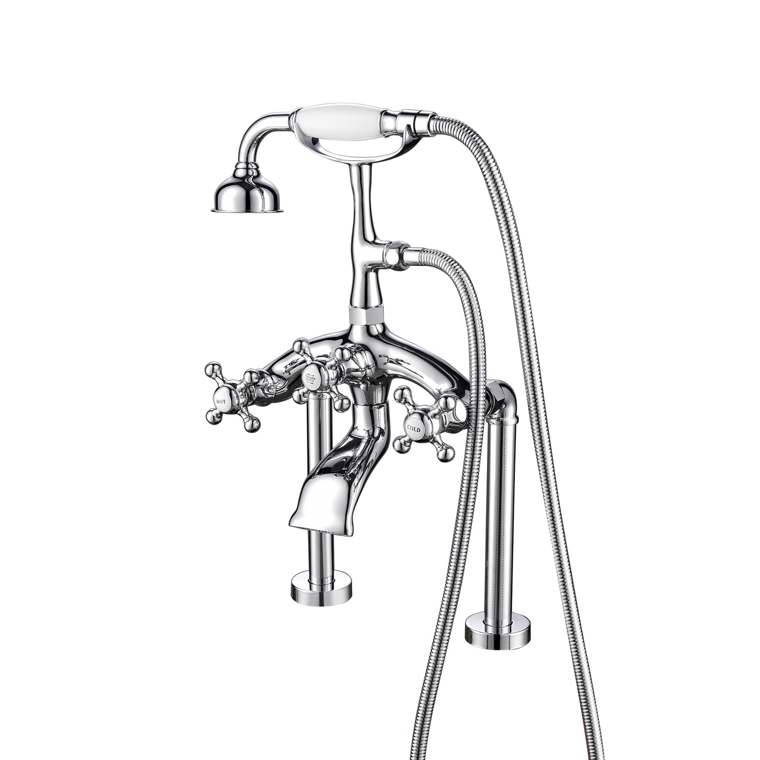 Barclay's vintage tub rim-mount faucet features a luxurious metal hand held shower perched upon a wide elephant spout and decorative metal cross handles. Ceramic disc cartridges ensure trouble free operation. This captivating filler adds elegance and functionality to your bath.