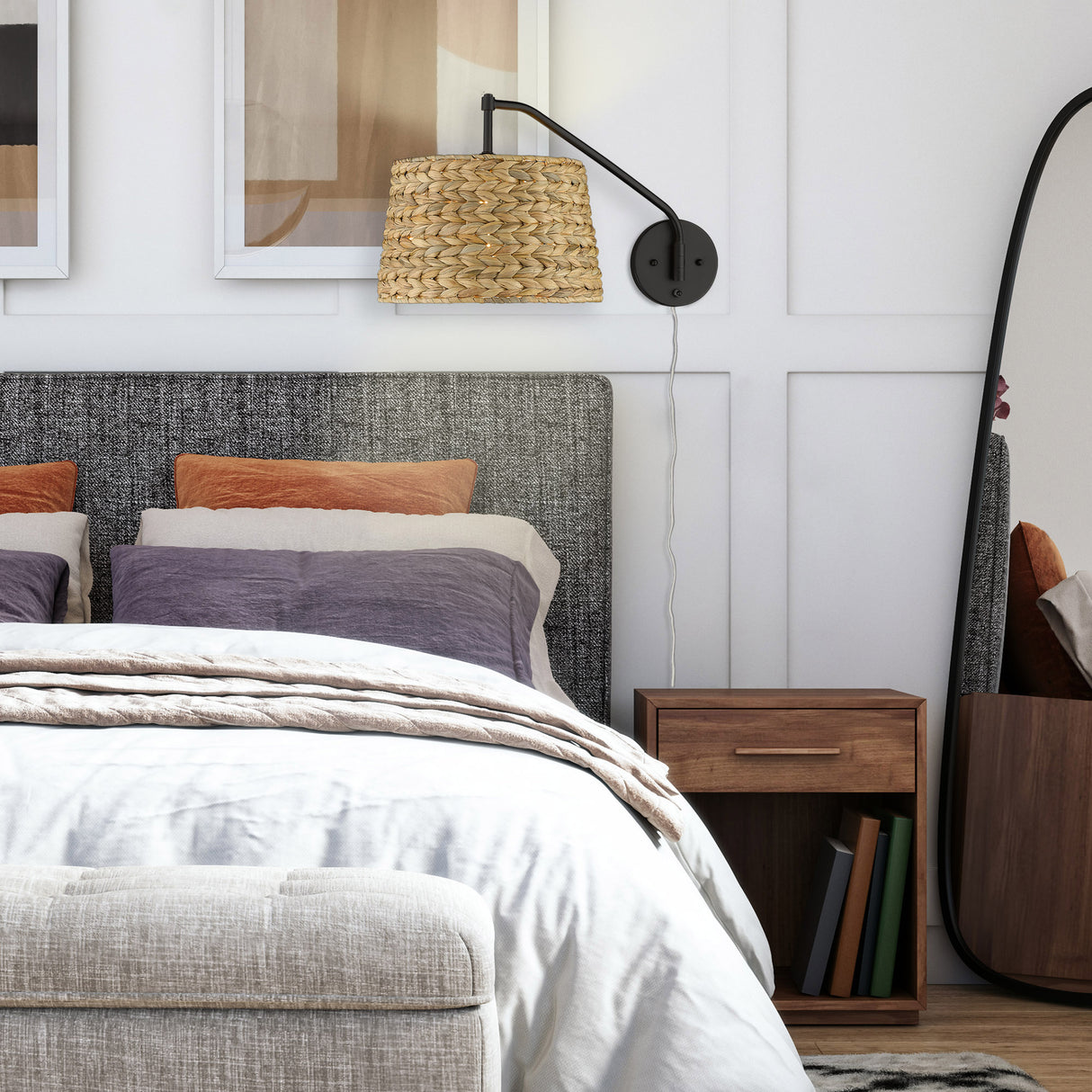 Ryleigh Articulating Wall Sconce in Matte Black with Woven Sweet Grass Shade
