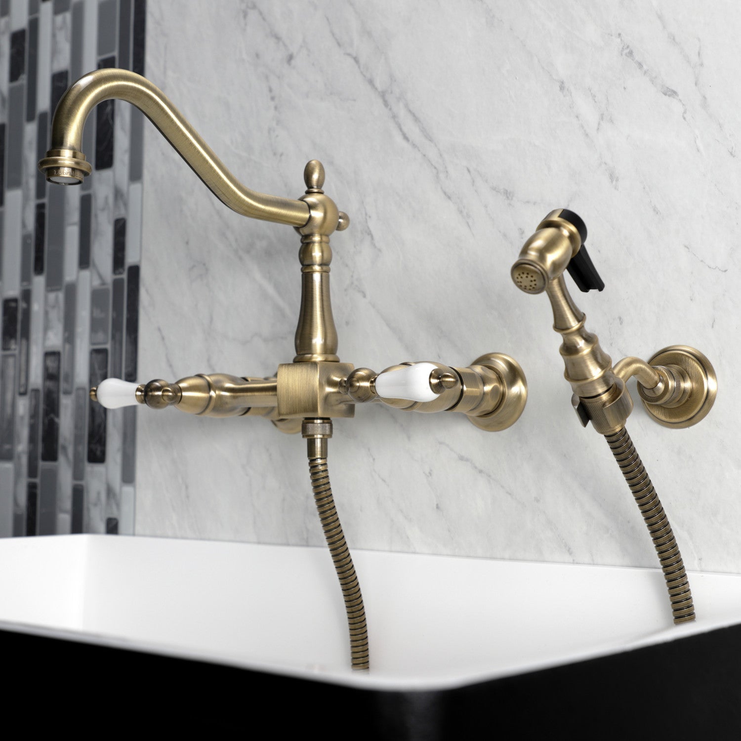 Heritage KS1243PLBS Two-Handle 2-Hole Wall Mount Bridge Kitchen Faucet with Brass Sprayer, Antique Brass