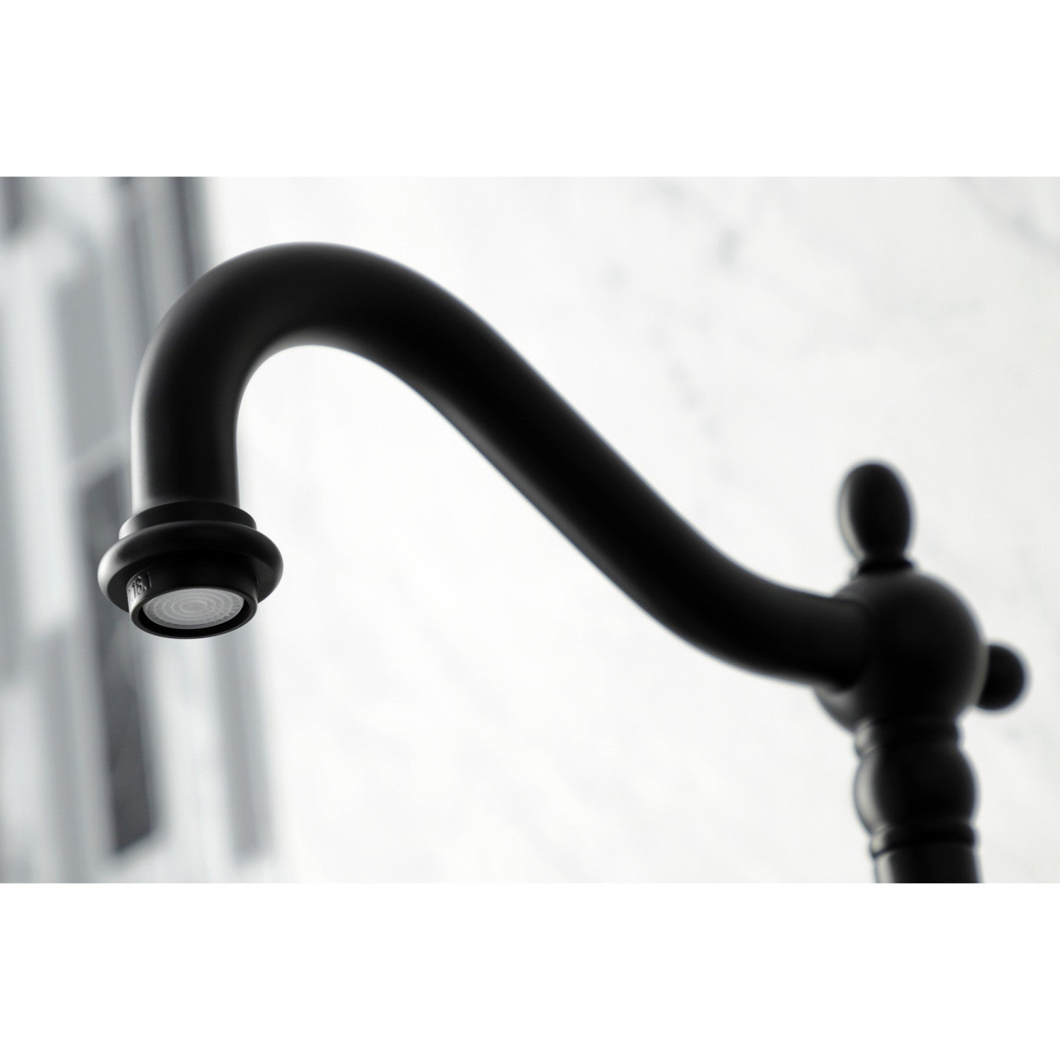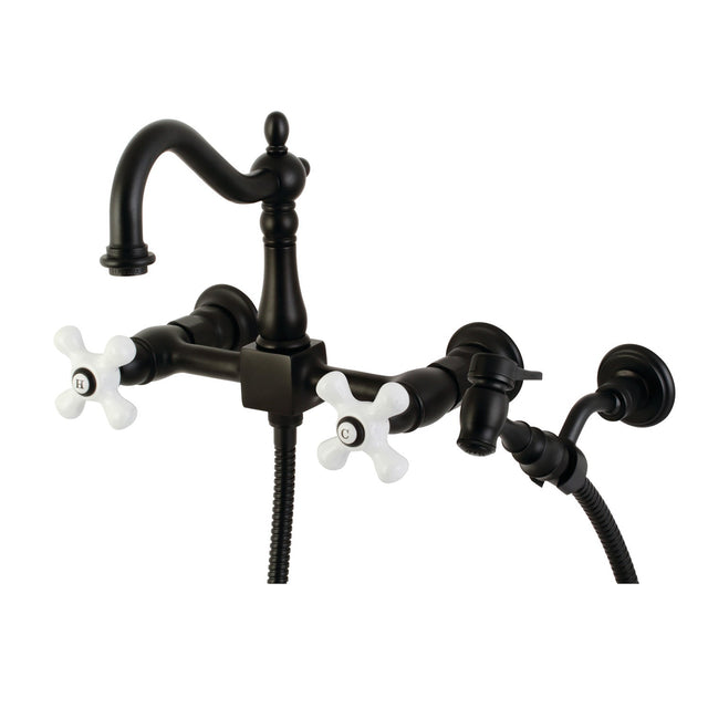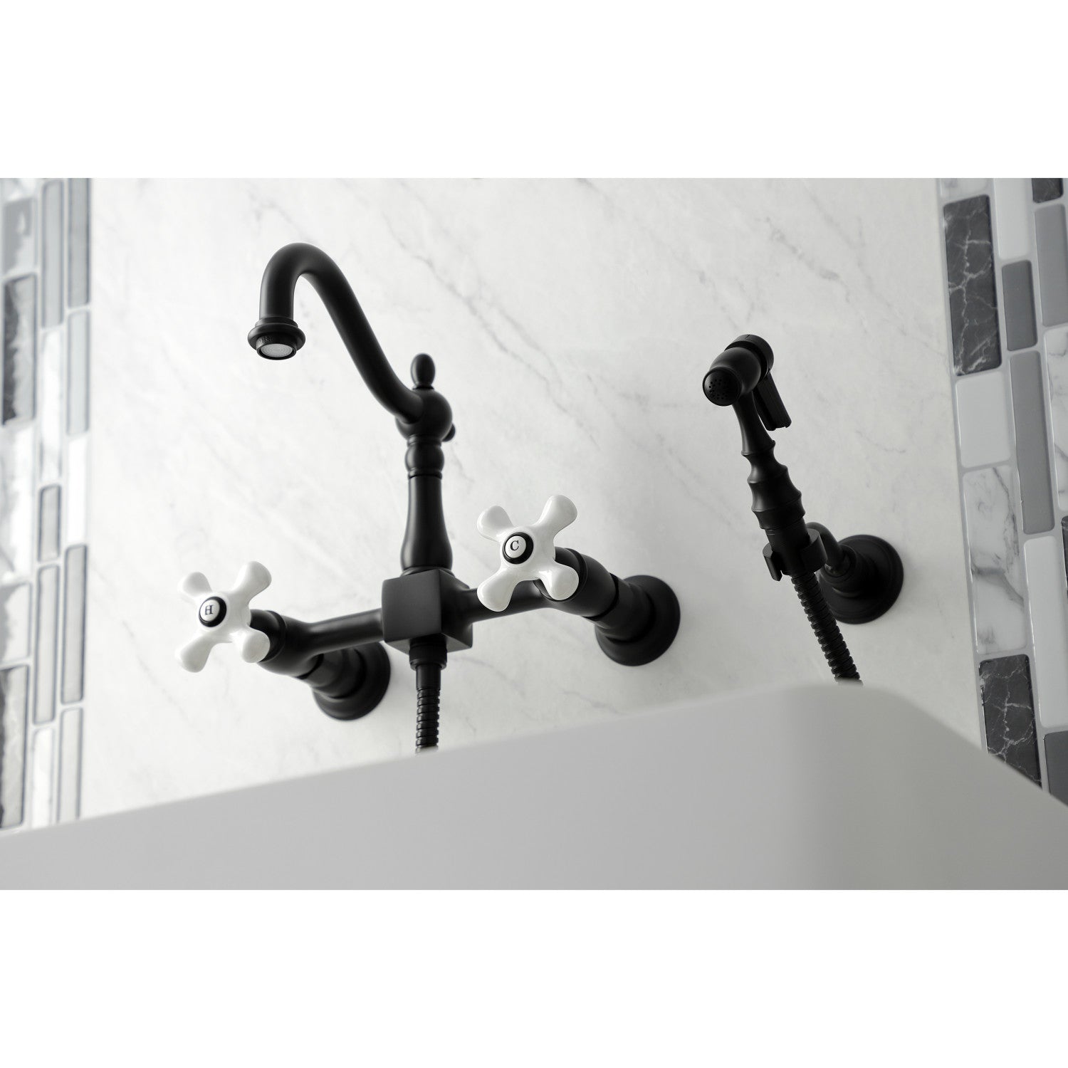 Heritage KS1260PXBS Two-Handle 2-Hole Wall Mount Bridge Kitchen Faucet with Brass Sprayer, Matte Black