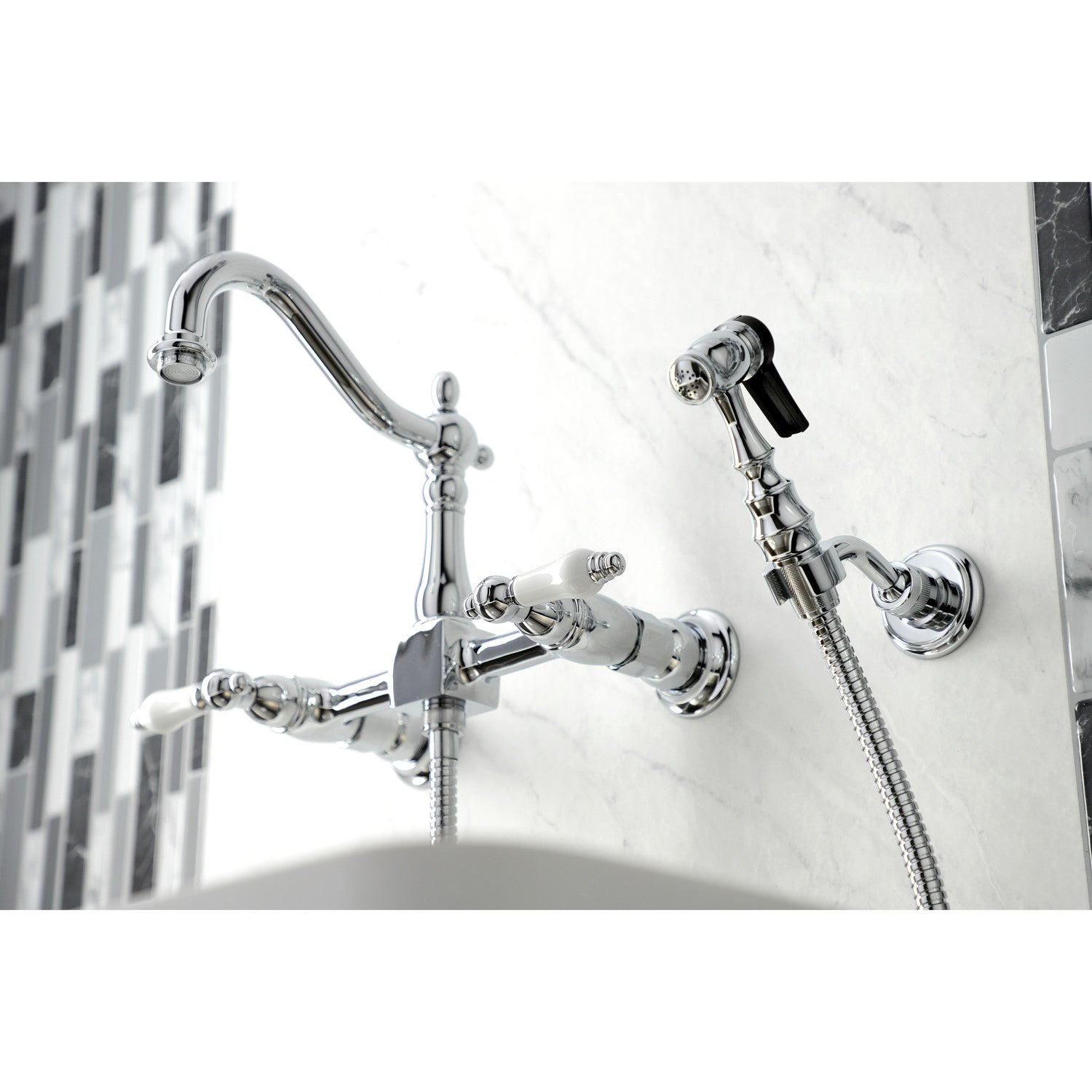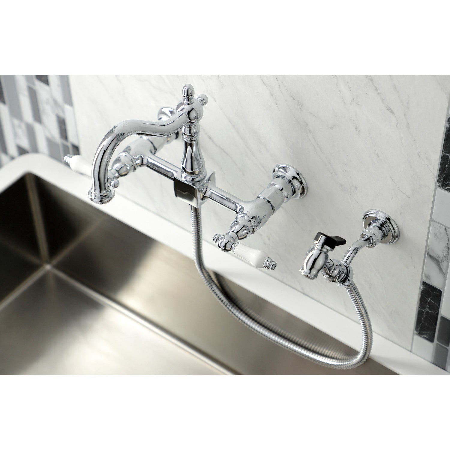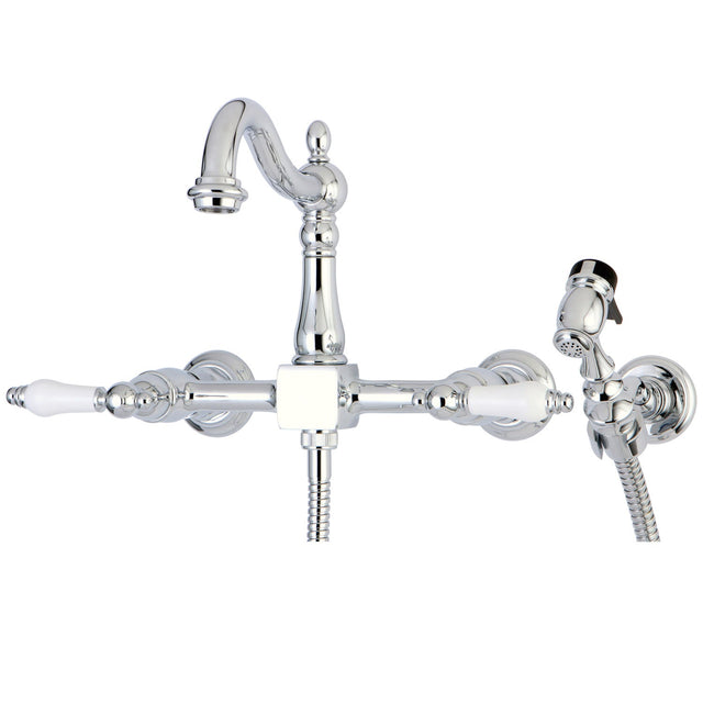 Heritage KS1261PLBS Two-Handle 2-Hole Wall Mount Bridge Kitchen Faucet with Brass Sprayer, Polished Chrome