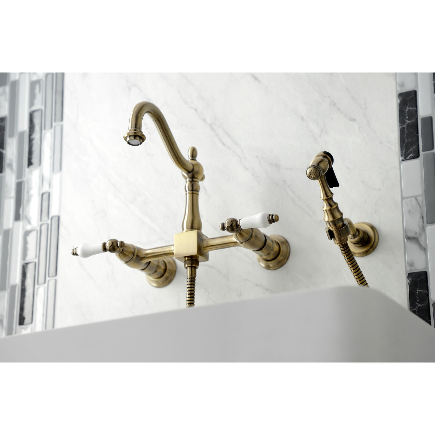 Heritage KS1263PLBS Two-Handle 2-Hole Wall Mount Bridge Kitchen Faucet with Brass Sprayer, Antique Brass
