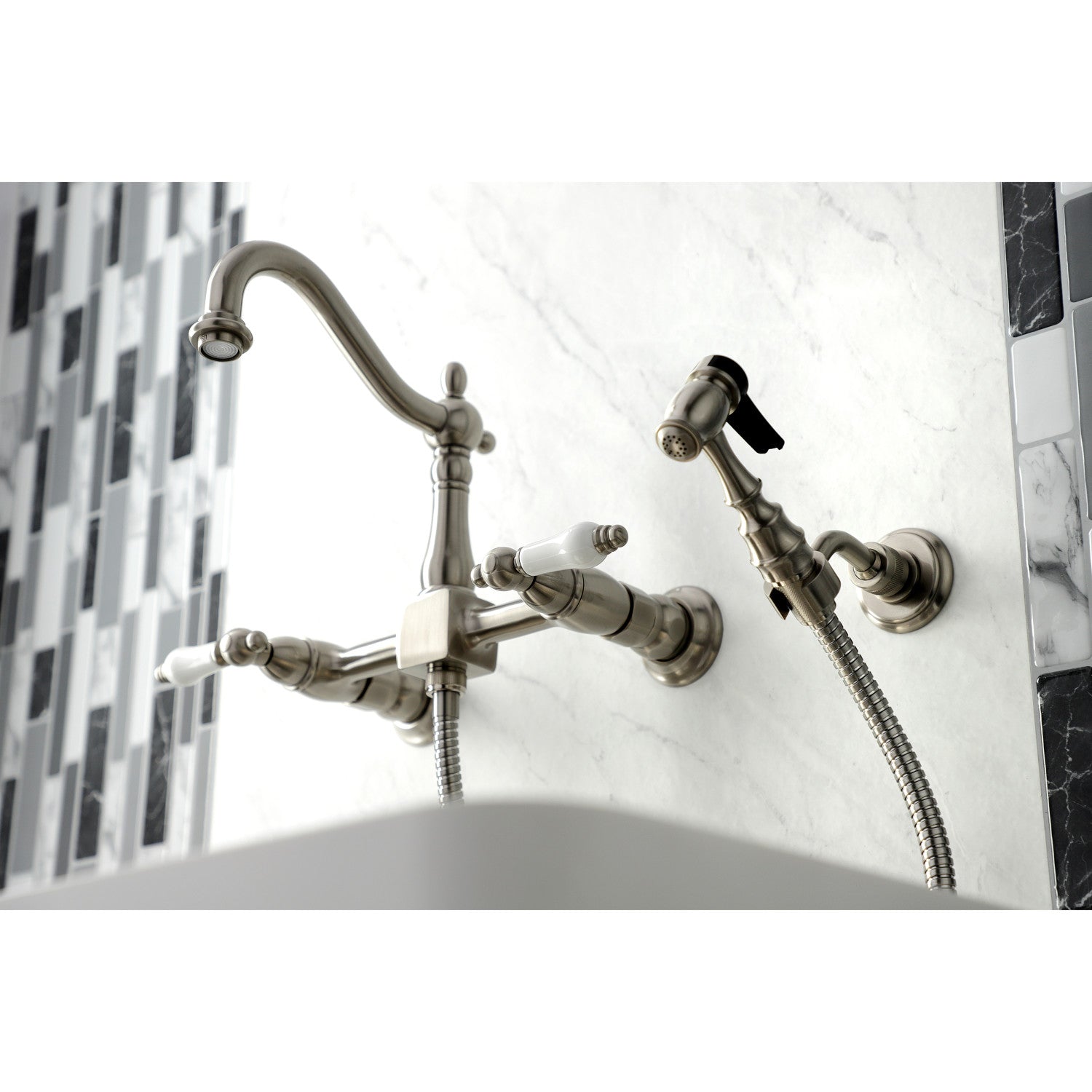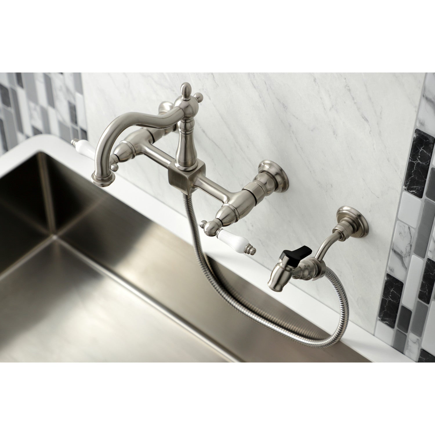 Heritage KS1268PLBS Two-Handle 2-Hole Wall Mount Bridge Kitchen Faucet with Brass Sprayer, Brushed Nickel