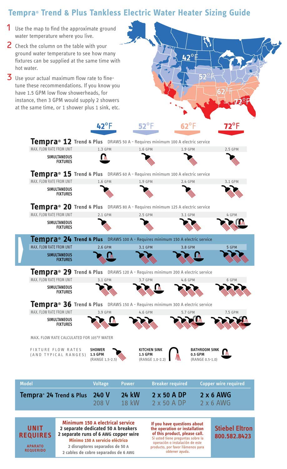 The Stiebel Eltron Tempra 24 Trend Tankless Water Heater will typically use 15-20% less energy compared to conventional electric tank water heaters. Although, its possible to save significantly more energy depending on personal home usage habits. The difference is that conventional tank water heaters continually store hot water, and as a result, lose 15%-20% of the total energy consumed to the environment around them. This is called standby heat loss. Tank water heaters that use gas or oil are even less efficient, because they also lose heat through their vents to the outdoors. Our tankless water heaters do not need venting, and will not store hot water, waiting for you to use it. They operate on-demand to provide continuous and endless hot water when you need it, and not waste energy when you dont. CERTIFICATIONS INCLUDE - ANSI/UL Std. 499, CSA Std. C22.2 No. 88, ISO 9001, WQA tested & certified against NSF/ANSI 372 for lead free compliance. TECHNICAL SPECIFICATIONS - Single Phase 50/60 Hz; Voltage: 240 V/208 V; Wattage: 24 KW/18 KW; Min recommended household electric service 150 A; Amperage draw: 100 A/88 A; Number and min. recommended size of circuit breakers: 2 x 50 A (DP); Number of runs and min. recommended wire size (copper): 2 x 8/2 AWG; Max. temperature rises: 92 F/82 F at 1.50 GPM, 73 F/54 F at 2.25 GPM, 54 F/41 F at 3.00 GPM, 37 F/27 F at 4.50 GPM; Min. water flow to activate unit: 0.50 GPM/1.9l/min; Weight: 21 lbs; Nominal water volume: 0.26 gal/1l; Max. inlet water temperature: 131 F/55 C; Working pressure: 150 PSI/10 BAR; Tested to pressure: 300 PSI / 20 BAR; Water connections: 3/4" NPT.