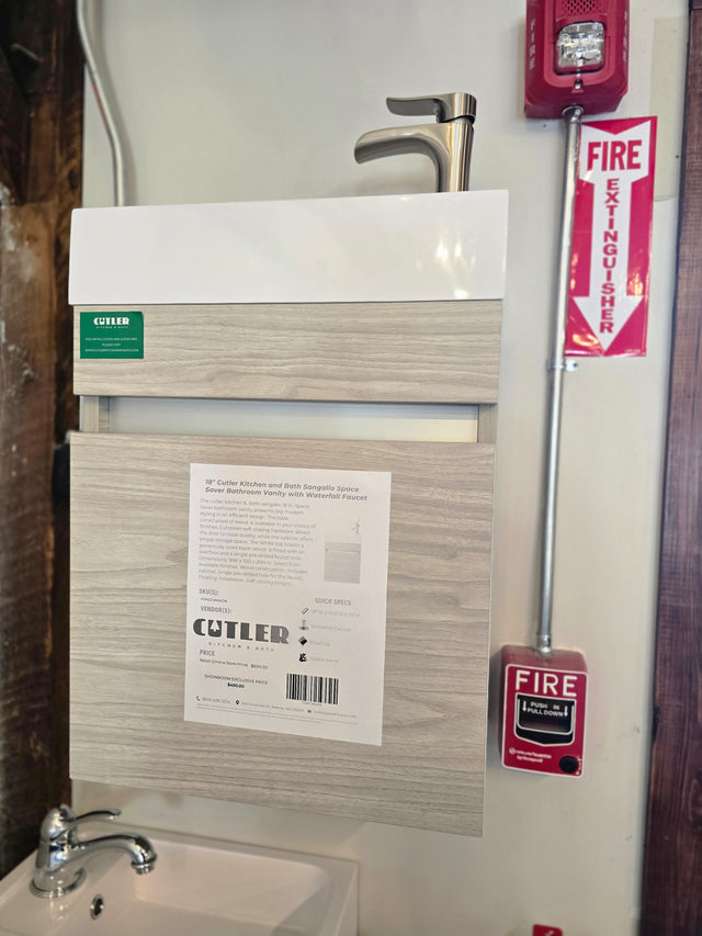 The cutler kitchen &. Bath sangallo 18 in. Space Saver bathroom vanity presents big modern styling in an efficient design. The base, constructed of wood, is available in your choice of finishes. European soft closing hardware allows the door to close quietly, while the cabinet offers ample storage space. The White top boasts a generously sized basin which is fitted with an overflow and a single pre-drilled faucet hole. Dimensions: 18W x 10D x 25H in. Select from available finishes. Wood construction. Includes cabinet. Single pre-drilled hole for the faucet. Floating installation. Soft closing hinges.