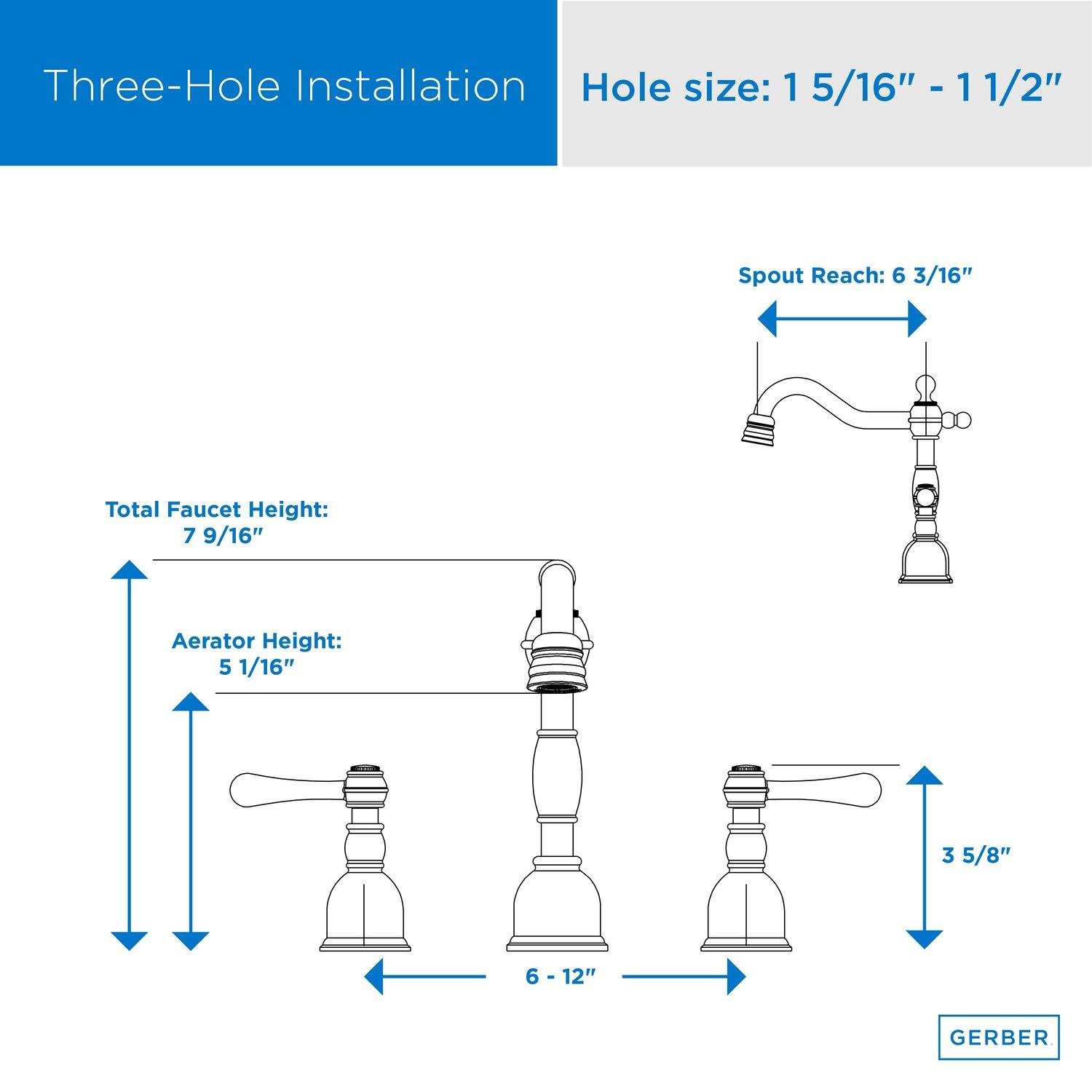 Stately curves embellished with vintage-style, bell-shaped handle bonnets, the Opulence Widespread Bathroom Sink Faucet combines expert engineering with solid craftsmanship. Incorporating cermic disc cartridges, this faucet offers drip-free performance and effortless turning operation. Two separate, ADA-compliant handle controls allow for precise water temperature and volume control. A WaterSense certified 1.2 gpm flow rate will save water, cut utility rates, and provide a clear, more hygienic stream via the laminar flow aerator. Three hole mounting allows for variable width installation from 6" tto 12" A metal touch-down drain and all assembly hardware are included for complete installation in no time. Product Information Product Overview Connection Type: 1/2 -14npsm ConnectionFlow Rate: 1.2gpm Max Flow Rate @ 60 psiInstallation: 3-Hole Installation 6 -12 InstallationSpray/Stream Function: Features a Clear Non-Splash Laminar Water StreamBrand: Gerber Features Cartridge Type: Includes Durable Ceramic Disc Valve for Drip-Free PerformanceSpout Swivel: 360-Degree Swivel SpoutWarranty: Limited lifetime Description Like a proper artist the Opulence Mini-Widespread Lavatory Faucet is always ready to perform. And while you re showcasing its sophisticated design; the reliable operation and well-made construction truly make it a star. Perfect for tight spaces this faucet highlights a laminar flow for a clear water stream and a ceramic disc valve for smooth turning and drip-free performance. Installation is easy with a matching touch down drain and the Quick Connect System. Components Drain Type: Includes Metal Touch-Down Drain Assembly for Easy Installation