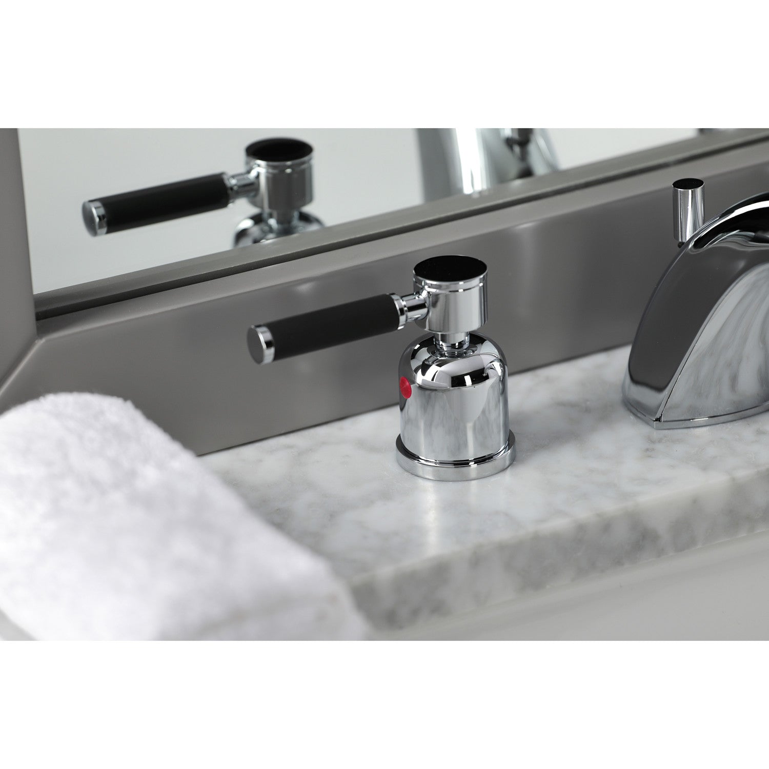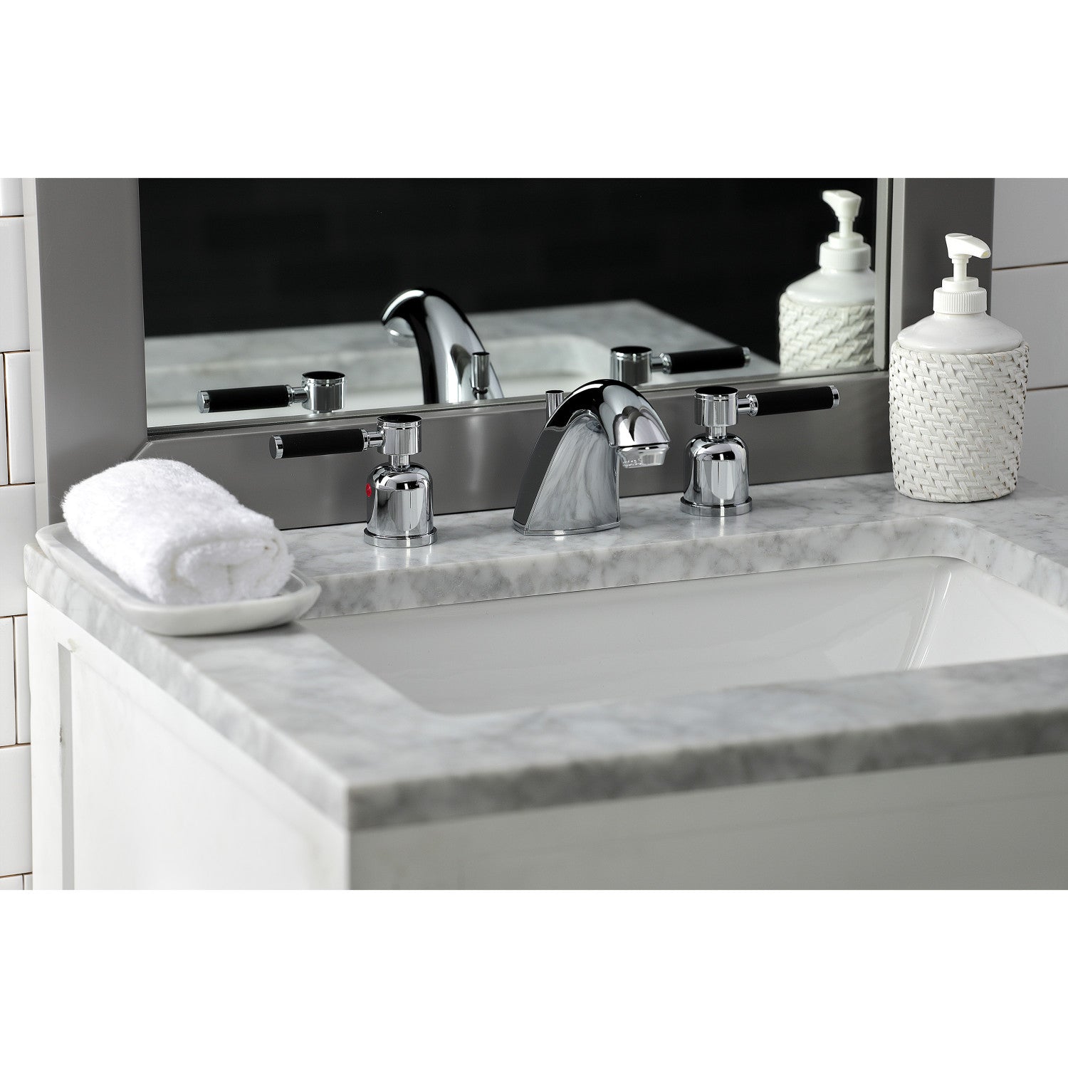 This faucet tastefully interweaves top-notch ergonomic design and the sheen of contemporary simplicity with its black silicone rubber coated handles and cylindrical facets. Ideal for more spacious bathrooms, widespread faucets are more spread apart and feature a 3-hole installation. The Kaiser widespread bathroom faucet and its featured sturdy brass construction and premium polished chrome finish are guaranteed to glamorize your home's modern ensemble for years to come. Furnish your home surrounding with the modern flair of this fixture. A matching finish drain is also included.