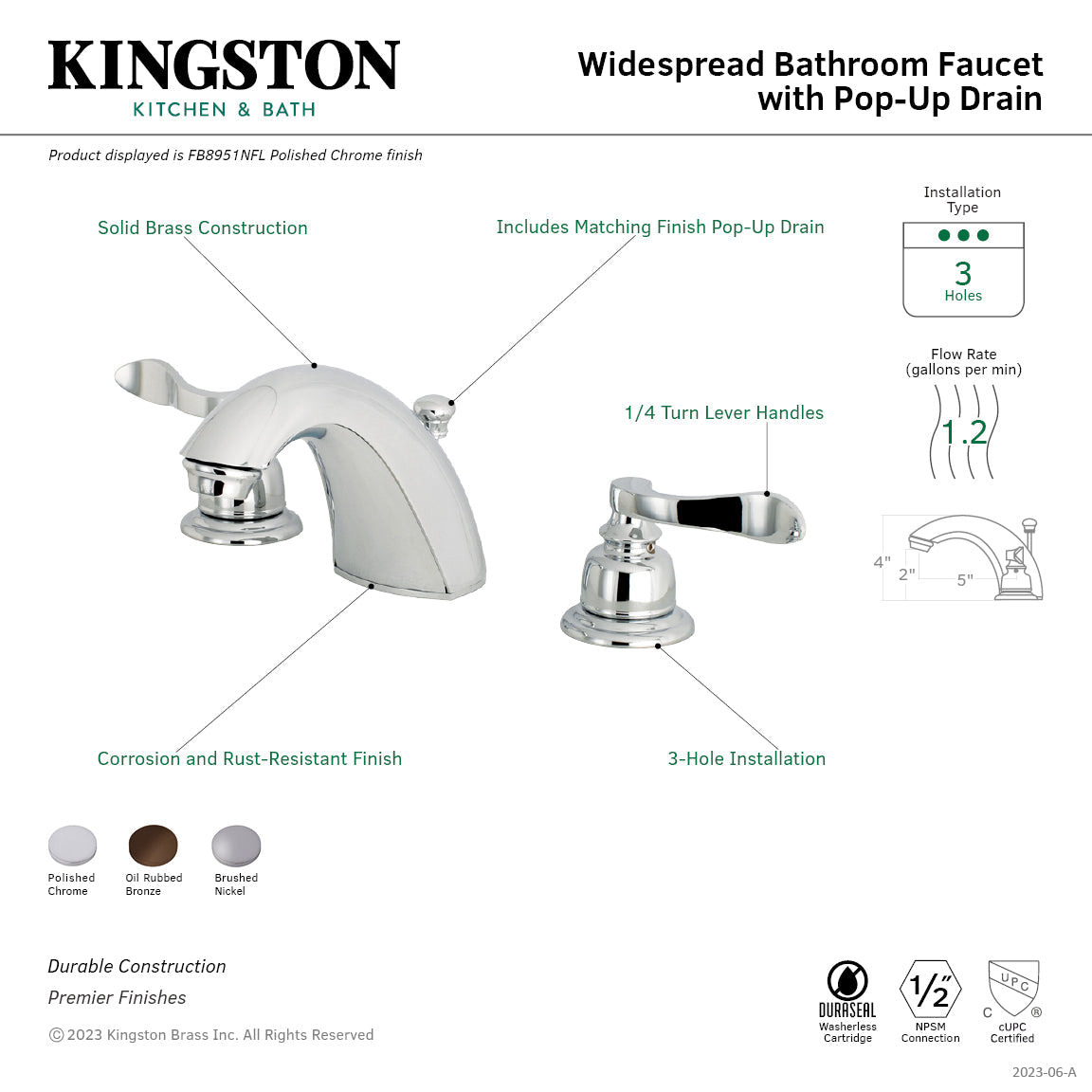 NuWave French FB8951NFL Two-Handle 3-Hole Deck Mount Widespread Bathroom Faucet with Plastic Pop-Up, Polished Chrome