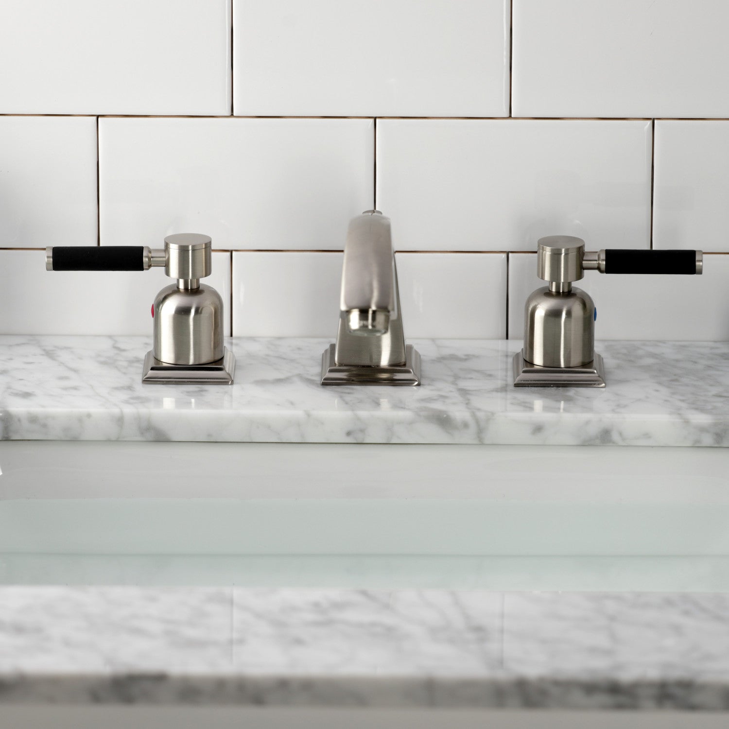 This faucet tastefully interweaves top-notch ergonomic design and the sheen of contemporary simplicity with its black silicone rubber coated handles and cylindrical facets. Ideal for more spacious bathrooms, widespread faucets are more spread apart and feature a 3-hole installation. The Kaiser 8-inch widespread bathroom faucet and its featured sturdy brass construction and premium brushed nickel finish are guaranteed to glamorize your home's modern ensemble for years to come. Furnish your home surrounding with the modern flair of this fixture. A matching finish drain is also included.