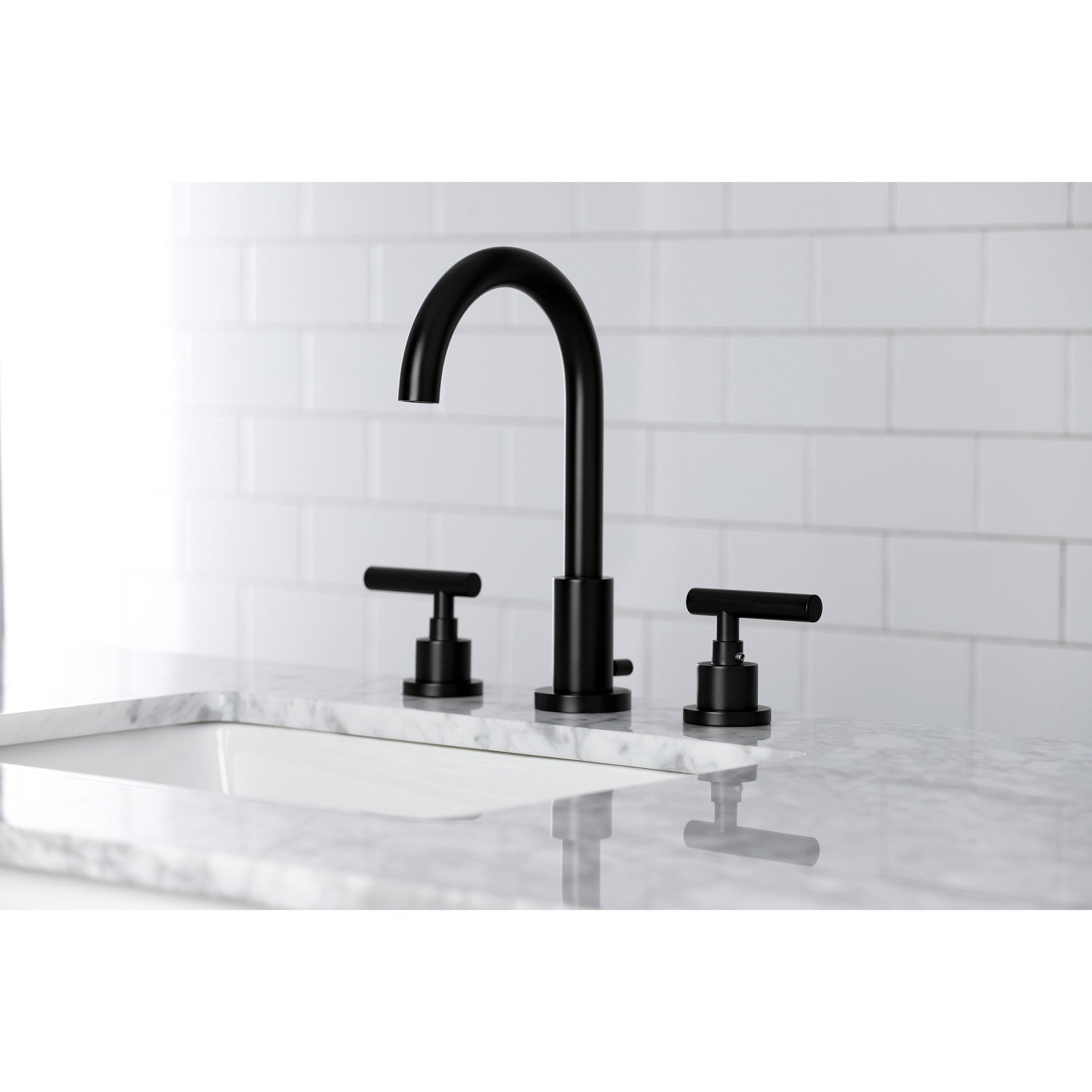 Embellish your contemporary home with the swankiness and elegance that this faucet provides. Ideal for more spacious bathrooms, widespread faucets are more spread apart and feature a 3-hole installation. The Manhattan widespread bathroom faucet with brass pop-up and its featured sturdy brass construction and premium matte black finish are guaranteed to glamorize your home's modern ensemble for years to come. Emulate the distinguished opulence of Manhattan with this faucet's departure from mediocrity. A matching finish drain is also included.