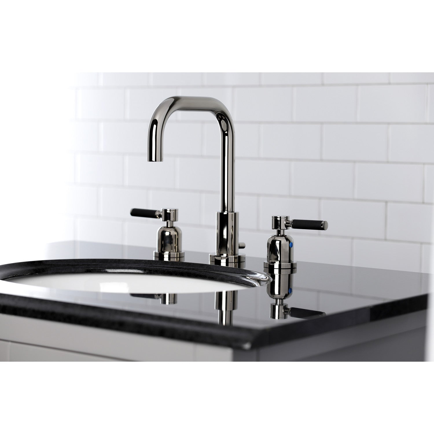 This faucet tastefully interweaves top-notch ergonomic design and the sheen of contemporary simplicity with its black silicone rubber coated handles and cylindrical facets. Ideal for more spacious bathrooms, widespread faucets are more spread apart and feature a 3-hole installation. The Kaiser widespread bathroom faucet with brass pop-up and its featured sturdy brass construction and premium polished nickel finish are guaranteed to glamorize your home's modern ensemble for years to come. Furnish your home surrounding with the modern flair of this fixture. A matching finish drain is also included.