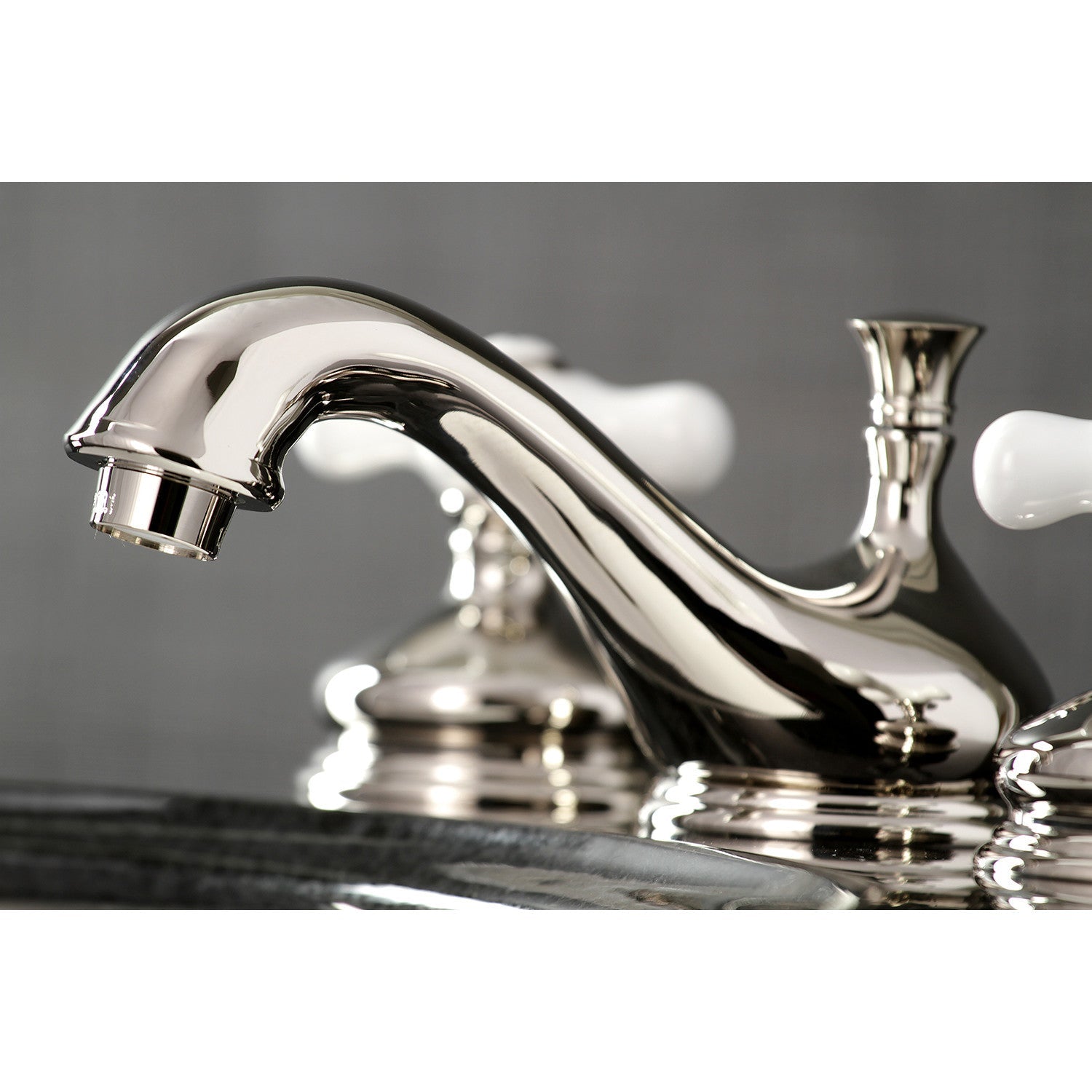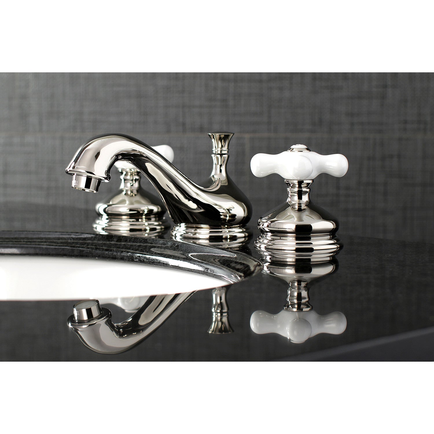 A lavish spark of traditionally stylized glamour is brought to your bathroom ensemble with this beautiful faucet. Ideal for more spacious bathrooms, widespread faucets are more spread apart and feature a 3-hole installation. The Heritage 8-inch widespread bathroom faucet with brass pop-up and its featured sturdy brass construction and premium polished nickel finish are guaranteed to glamorize your home's traditional ensemble for years to come. Celebrate sophistication and traditional decor with this statement piece. A matching finish drain is also included.