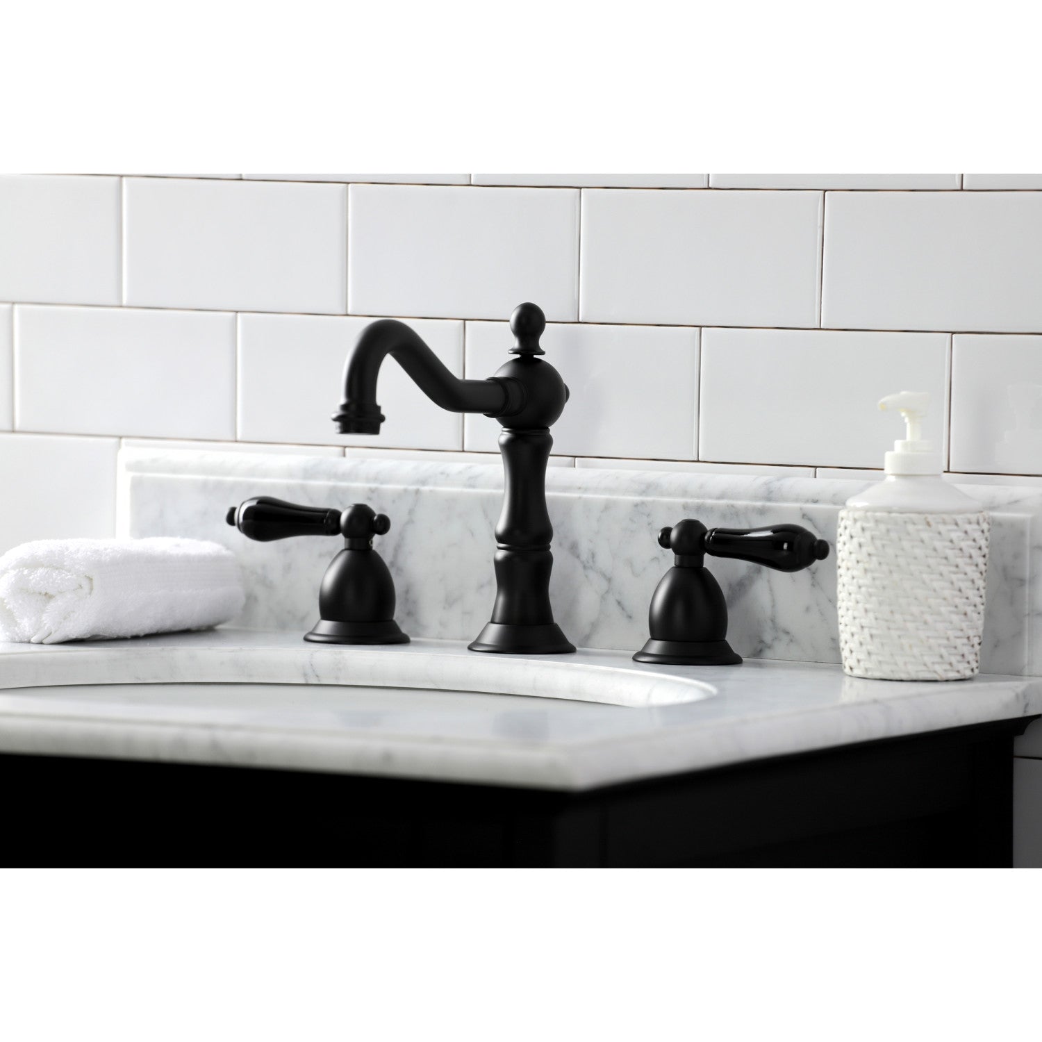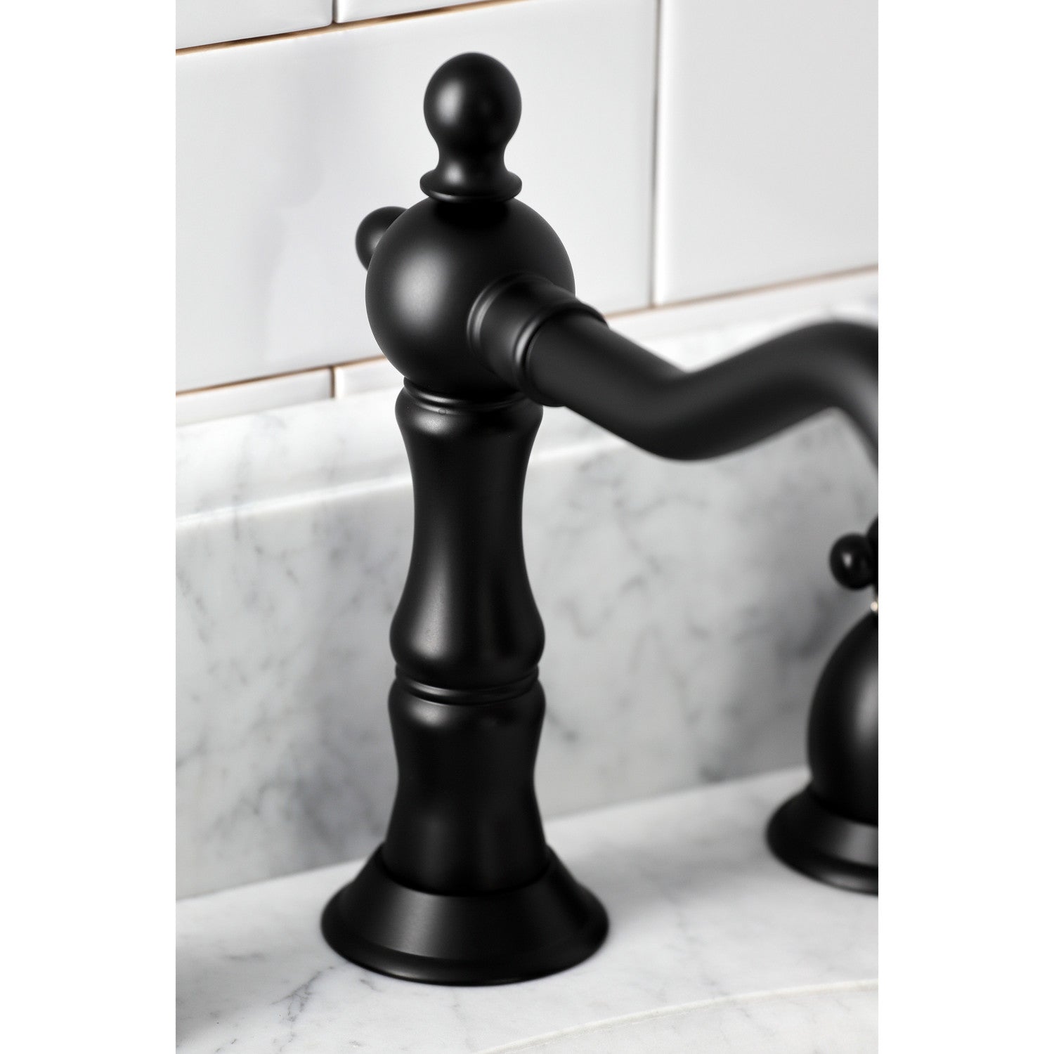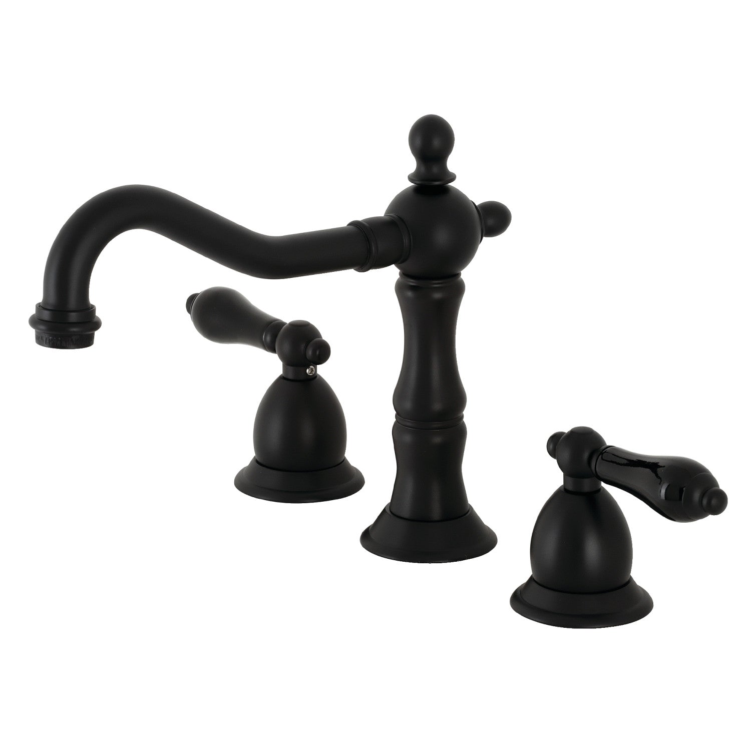 Crafted in commendations to English nobility, the exemplary design of this faucet manifests regality and elegance with its black porcelain handles. Ideal for more spacious bathrooms, widespread faucets are more spread apart and feature a 3-hole installation. The Duchess widespread bathroom faucet with brass pop-up and its featured sturdy brass construction and premium matte black finish are guaranteed to glamorize your home's traditional ensemble for years to come. Glamorize your home today with the traditional elegance of this faucet. A matching finish drain is also included.