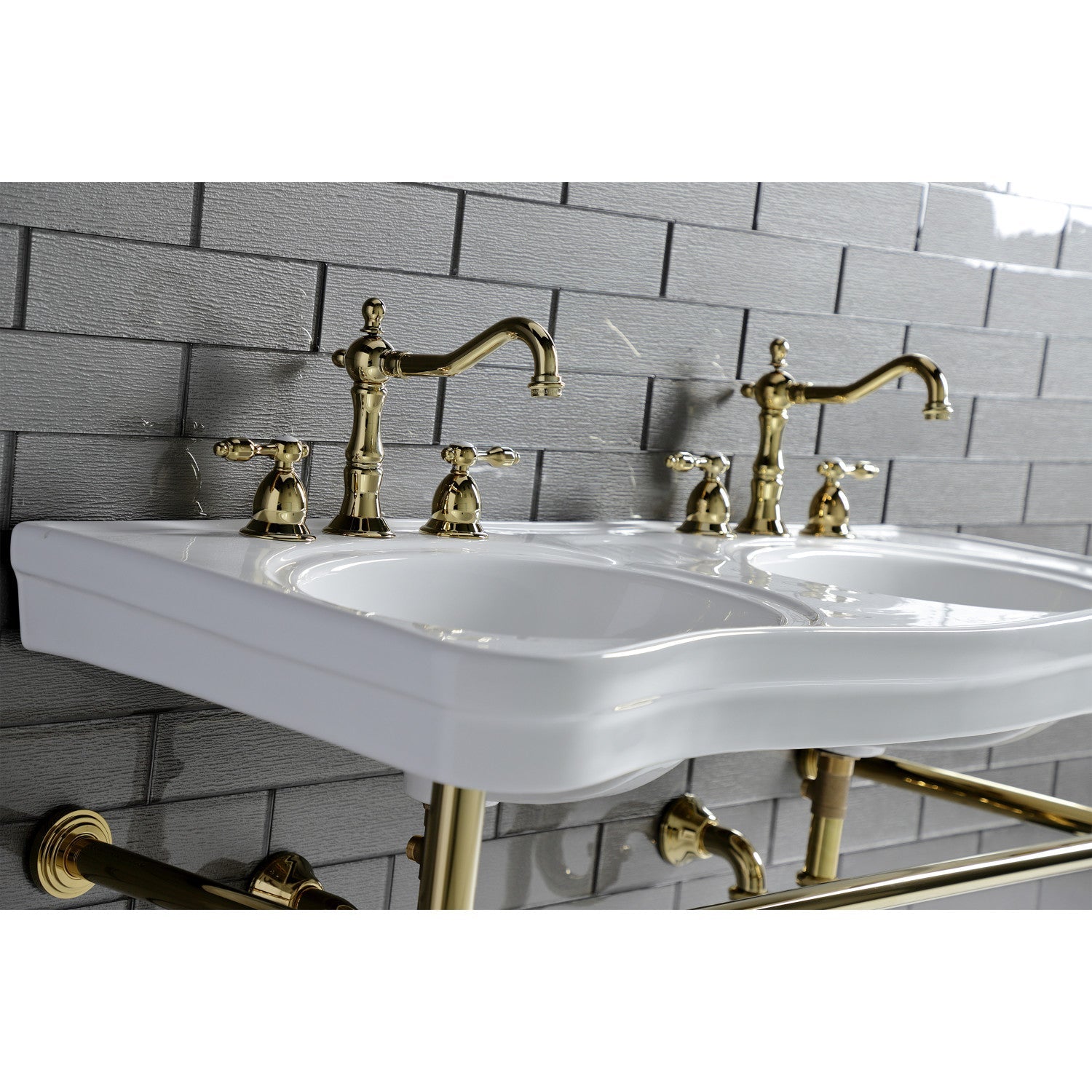 Offering a nod toward the past, this faucet is beautifully inspired by the vintage elegance of mid-19th Century design. Ideal for more spacious bathrooms, widespread faucets are more spread apart and feature a 3-hole installation. The Tudor 8-inch widespread bathroom faucet with brass pop-up and its featured sturdy brass construction and premium polished brass finish are guaranteed to glamorize your home's traditional ensemble for years to come. A unique and classically enchanting personality is embodied in this centerpiece. A matching finish drain is also included.