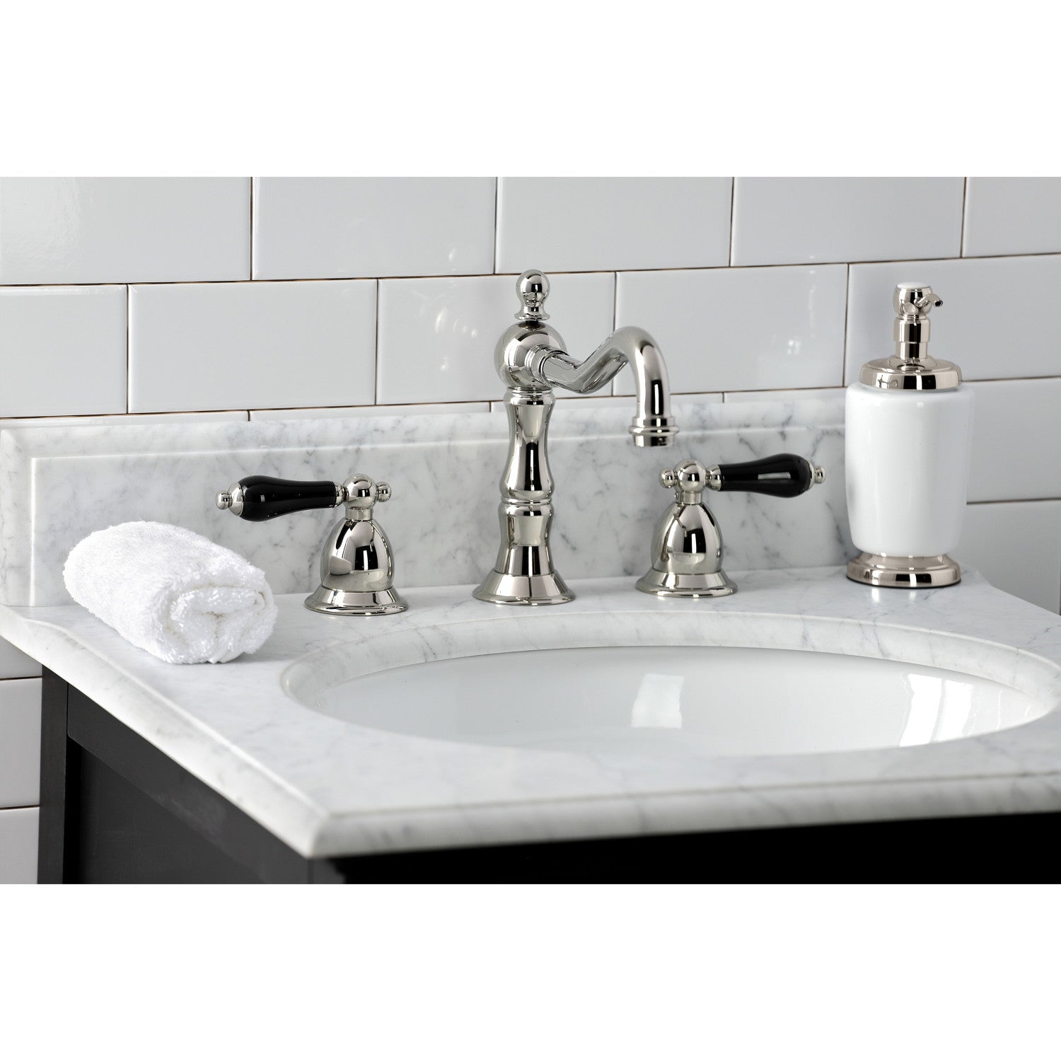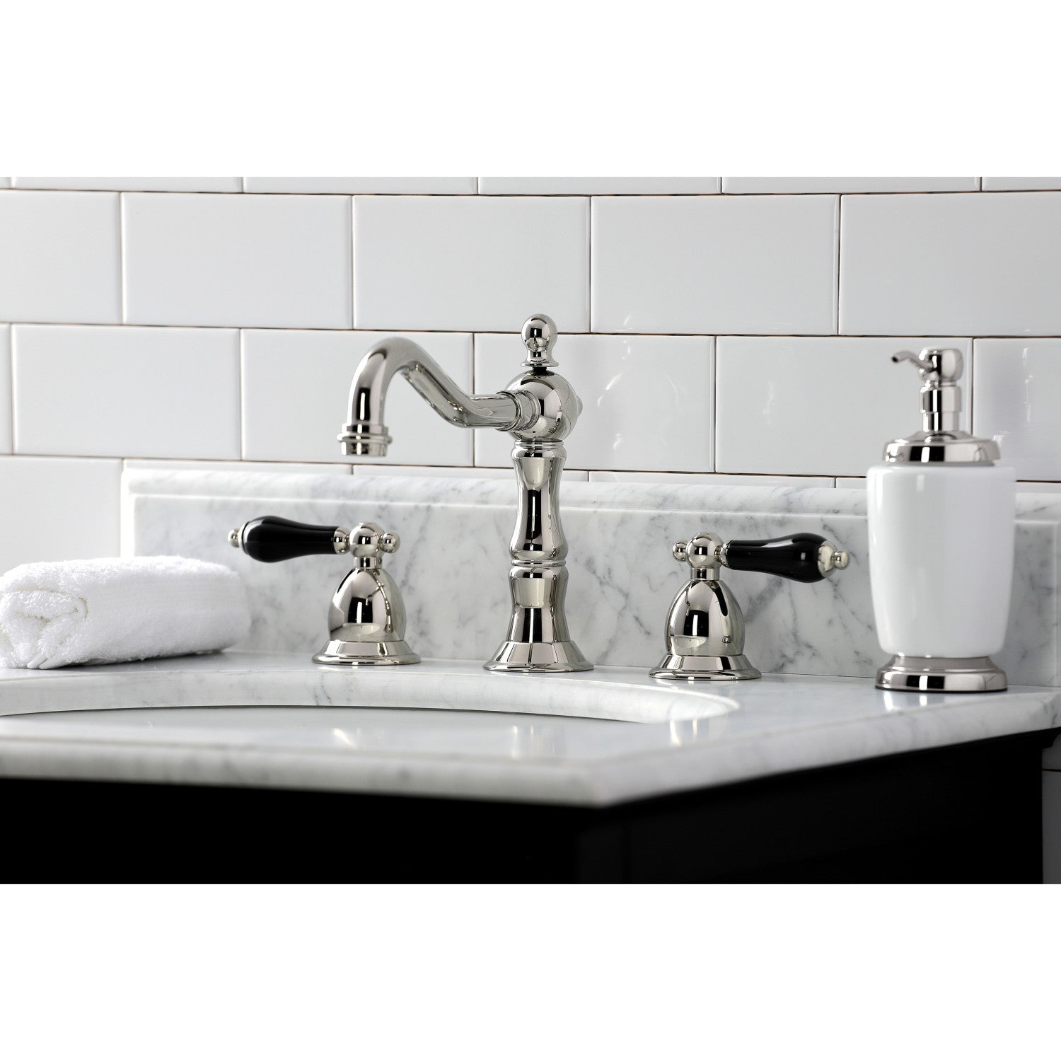 Crafted in commendations to English nobility, the exemplary design of this faucet manifests regality and elegance with its black porcelain handles. Ideal for more spacious bathrooms, widespread faucets are more spread apart and feature a 3-hole installation. The Duchess widespread bathroom faucet with brass pop-up and its featured sturdy brass construction and premium polished nickel finish are guaranteed to glamorize your home's traditional ensemble for years to come. Glamorize your home today with the traditional elegance of this faucet. A matching finish drain is also included.