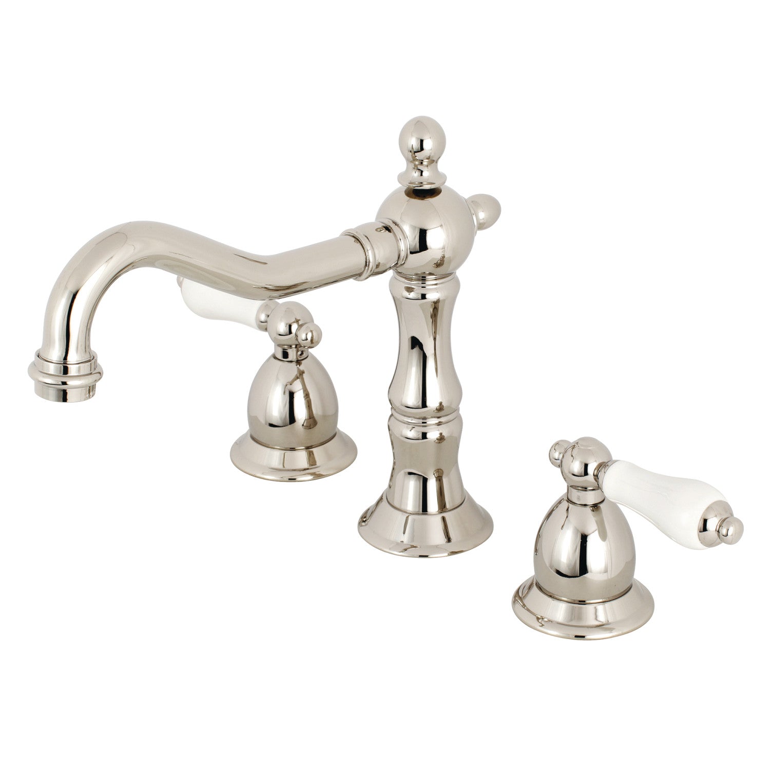 A lavish spark of traditionally stylized glamour is brought to your bathroom ensemble with this beautiful faucet. Ideal for more spacious bathrooms, widespread faucets are more spread apart and feature a 3-hole installation. The Heritage 8-inch widespread bathroom faucet with brass pop-up and its featured sturdy brass construction and premium polished nickel finish are guaranteed to glamorize your home's traditional ensemble for years to come. Celebrate sophistication and traditional decor with this statement piece. A matching finish drain is also included.