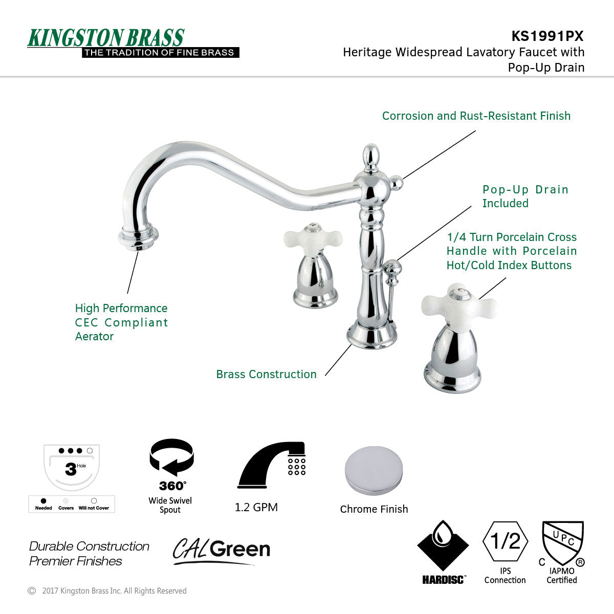 Heritage KS1991PX Two-Handle 3-Hole Deck Mount Widespread Bathroom Faucet with Brass Pop-Up, Polished Chrome