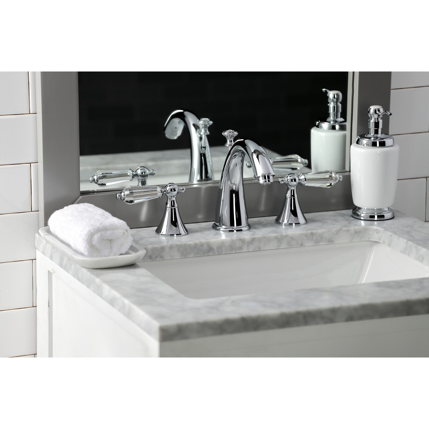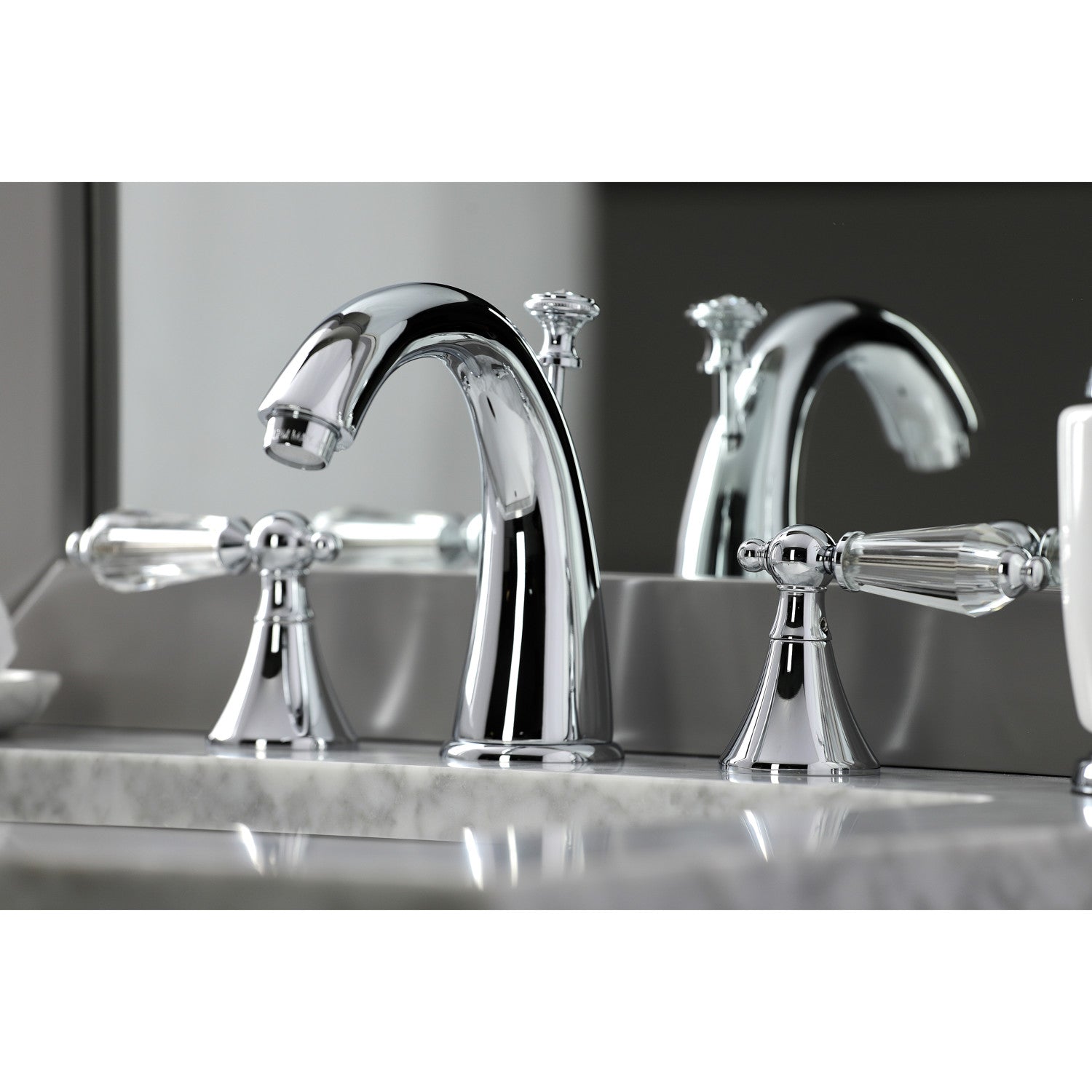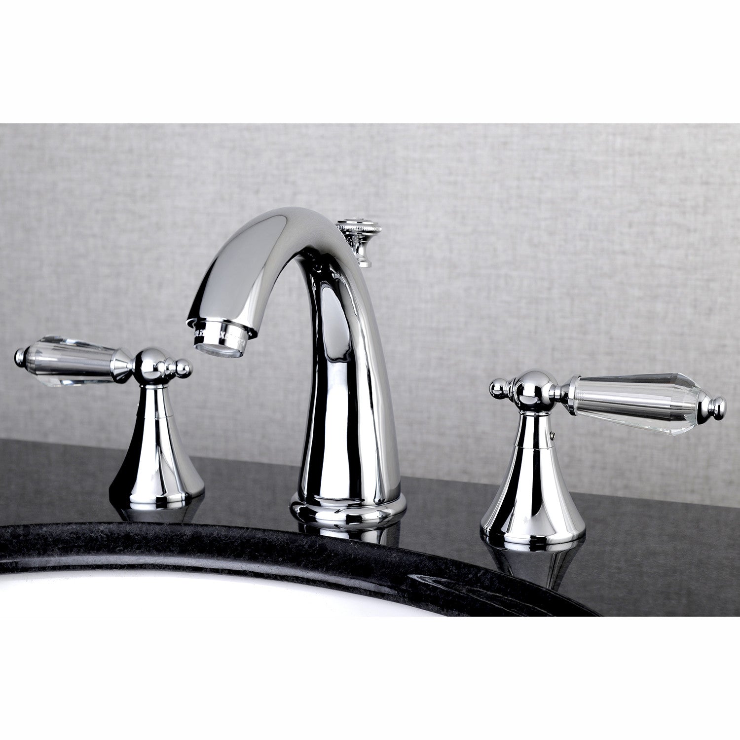 English historical splendor finds itself standing with stunning dignity in the prevalence of the refined acrylic lever handles of this faucet. Ideal for more spacious bathrooms, widespread faucets are more spread apart and feature a 3-hole installation. The Wilshire 8-inch widespread bathroom faucet with brass pop-up and its featured sturdy brass construction and premium polished chrome finish are guaranteed to glamorize your home's traditional ensemble for years to come. Inspire an atmosphere of classical grandeur with the unique appeal of timeless designs with this statement piece. A matching finish drain is also included.