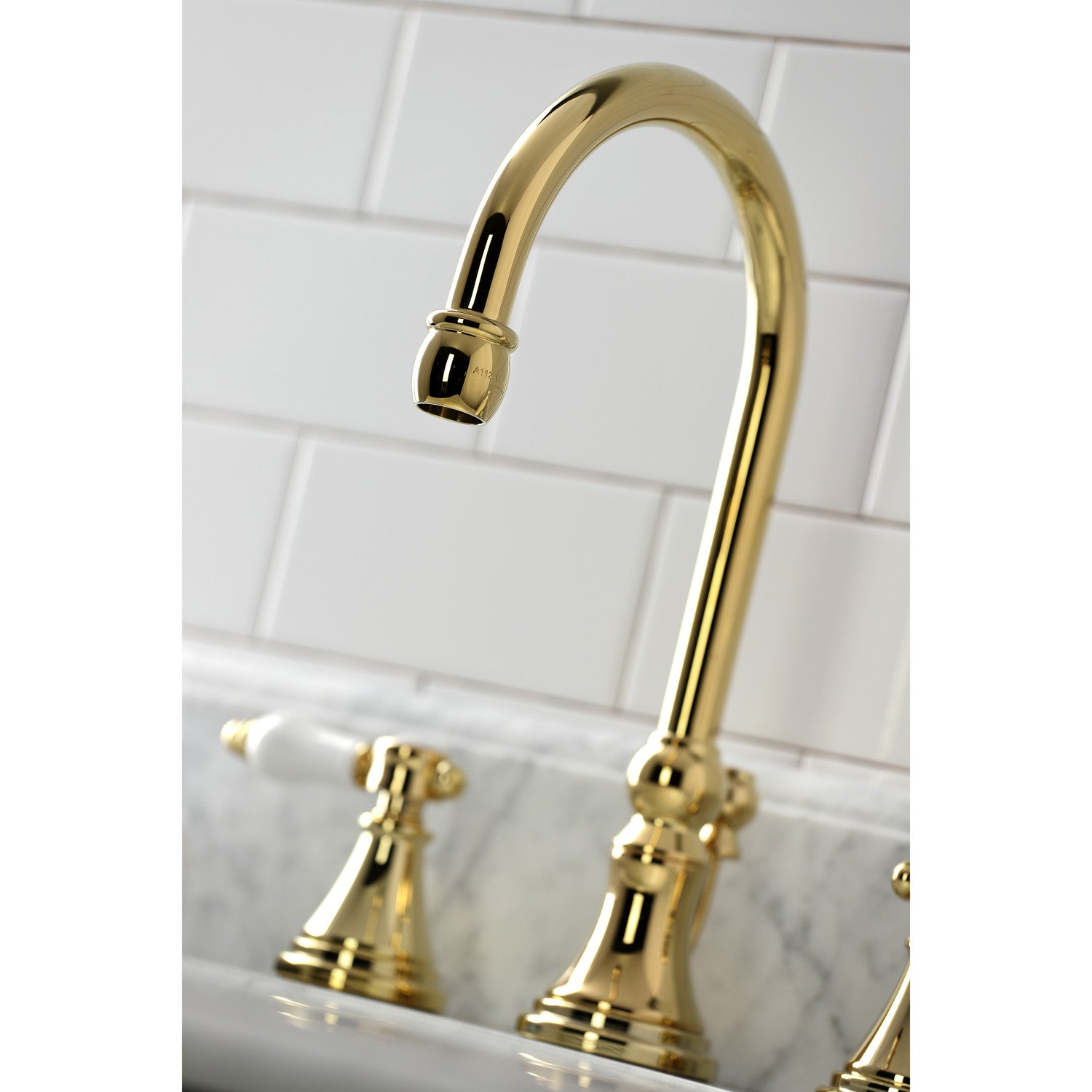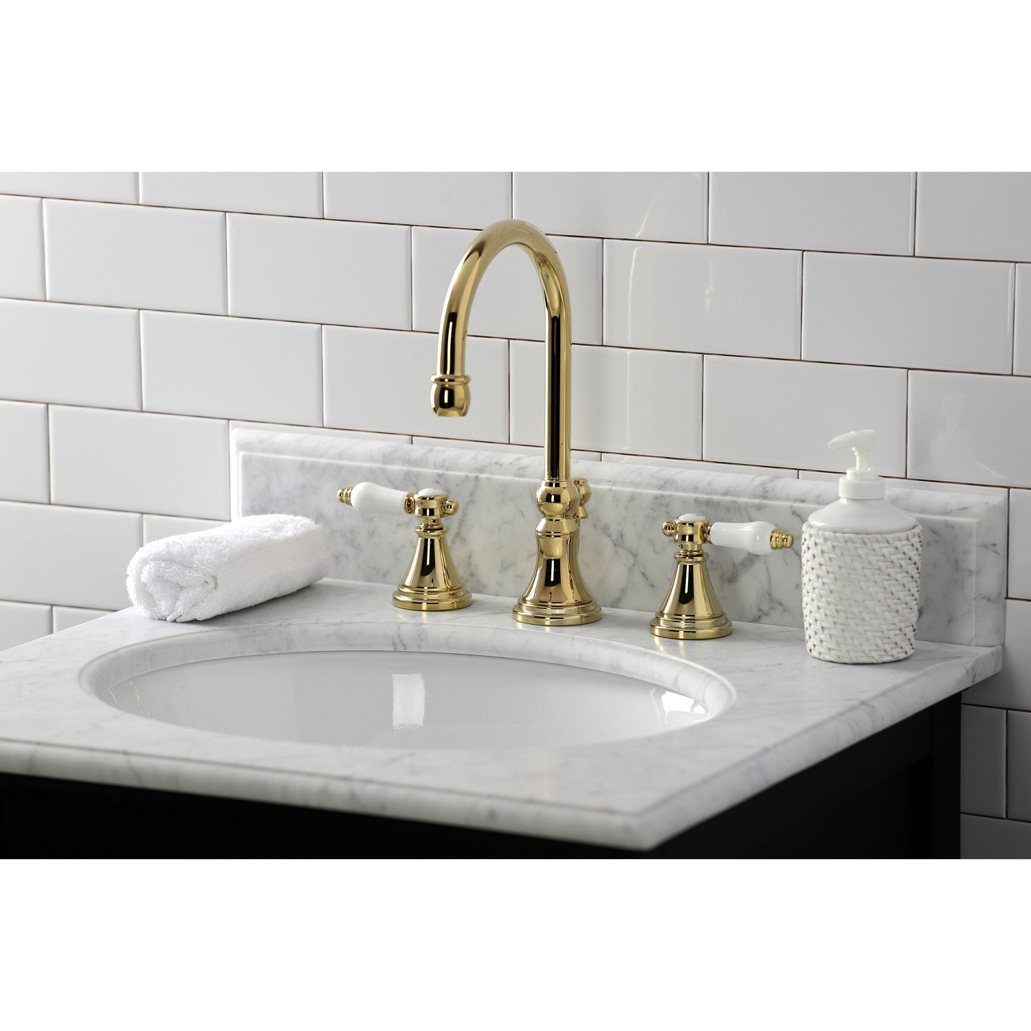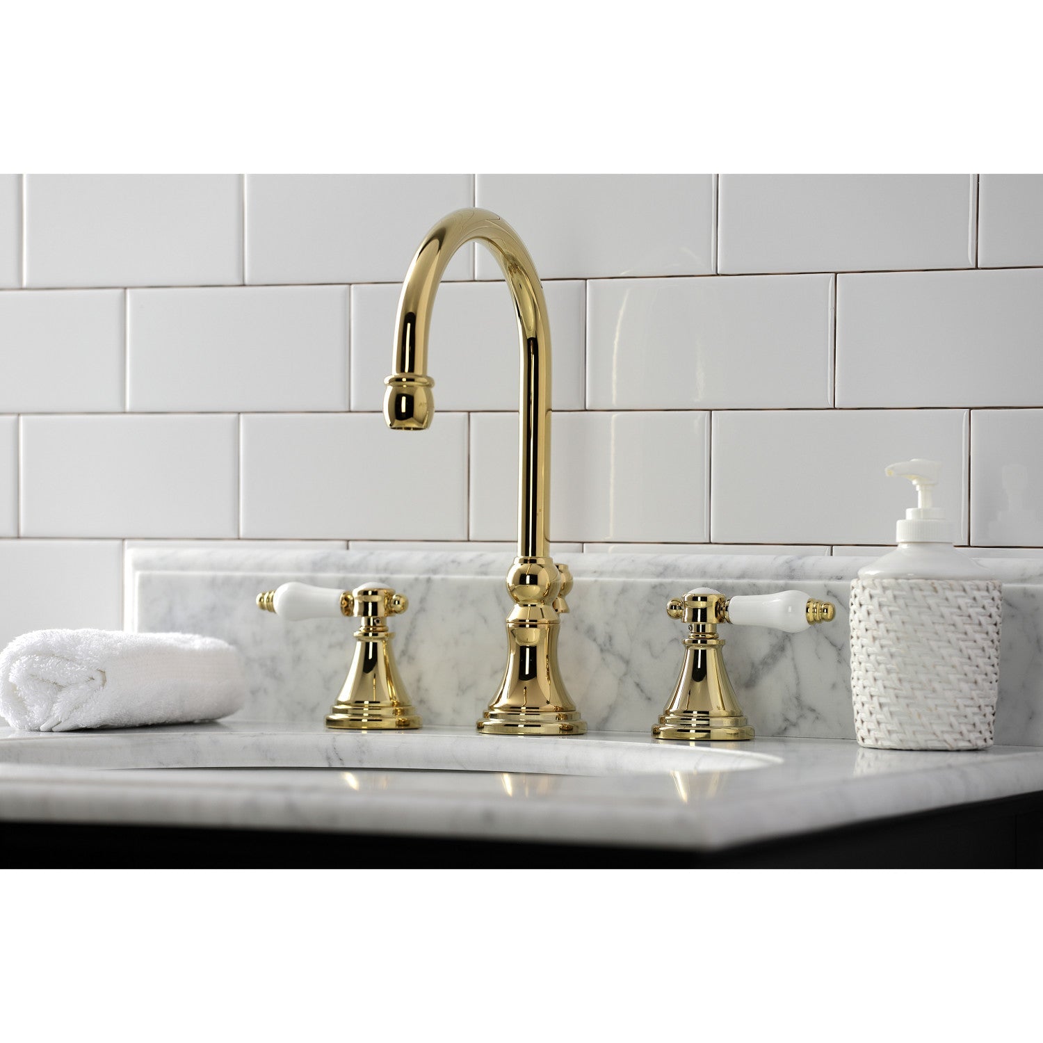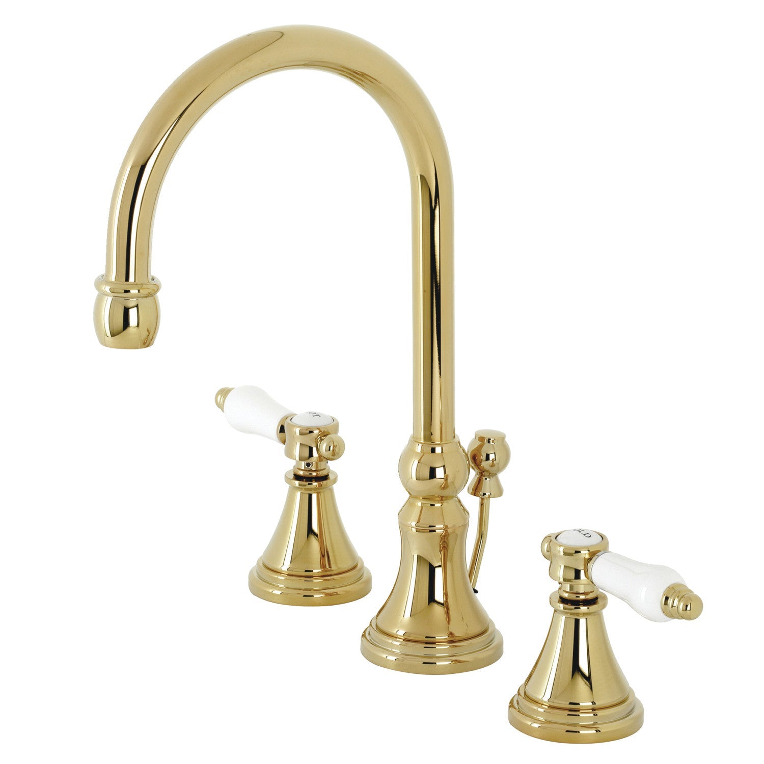 The graceful elegance of timeless design is beautifully merged between British flair and Victorian delicacy within this faucet's white porcelain levers. Ideal for more spacious bathrooms, widespread faucets are more spread apart and feature a 3-hole installation. The Bel-Air widespread bathroom faucet with brass pop-up and its featured sturdy brass construction and premium polished brass finish are guaranteed to glamorize your home's traditional ensemble for years to come. Varnish your bathroom with this state-of-the-art fixture. A matching finish drain is also included.