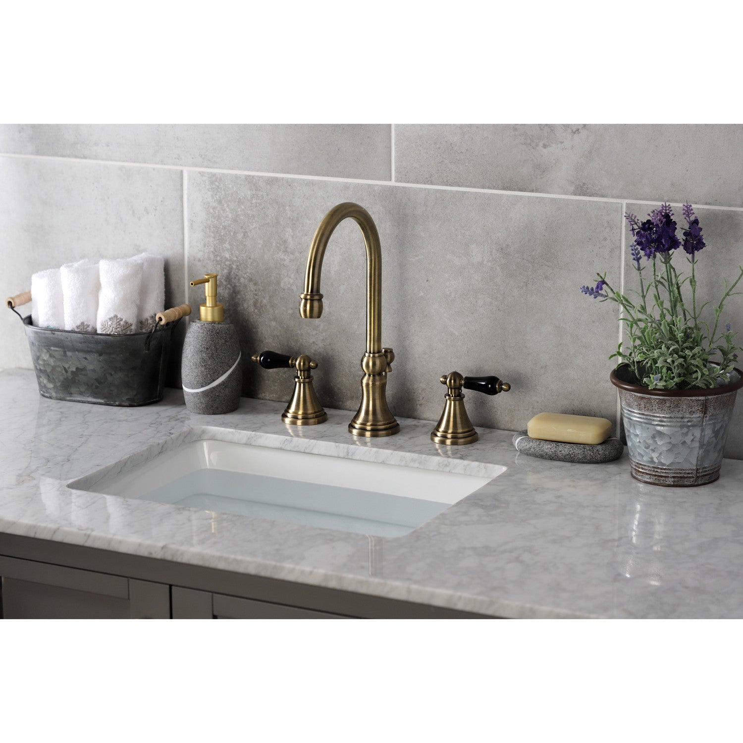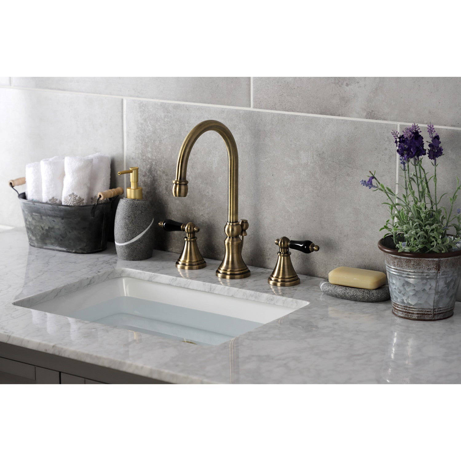 Crafted in commendations to English nobility, the exemplary design of this faucet manifests regality and elegance with its black porcelain handles. Ideal for more spacious bathrooms, widespread faucets are more spread apart and feature a 3-hole installation. The Duchess widespread bathroom faucet with brass pop-up and its featured sturdy brass construction and premium antique brass finish are guaranteed to glamorize your home's traditional ensemble for years to come. Glamorize your home today with the traditional elegance of this faucet. A matching finish drain is also included.
