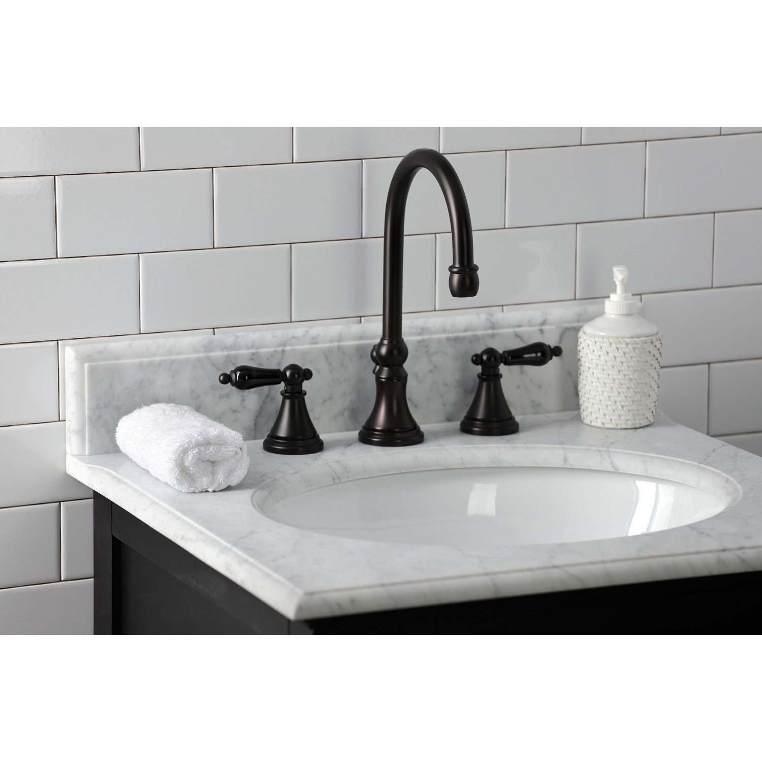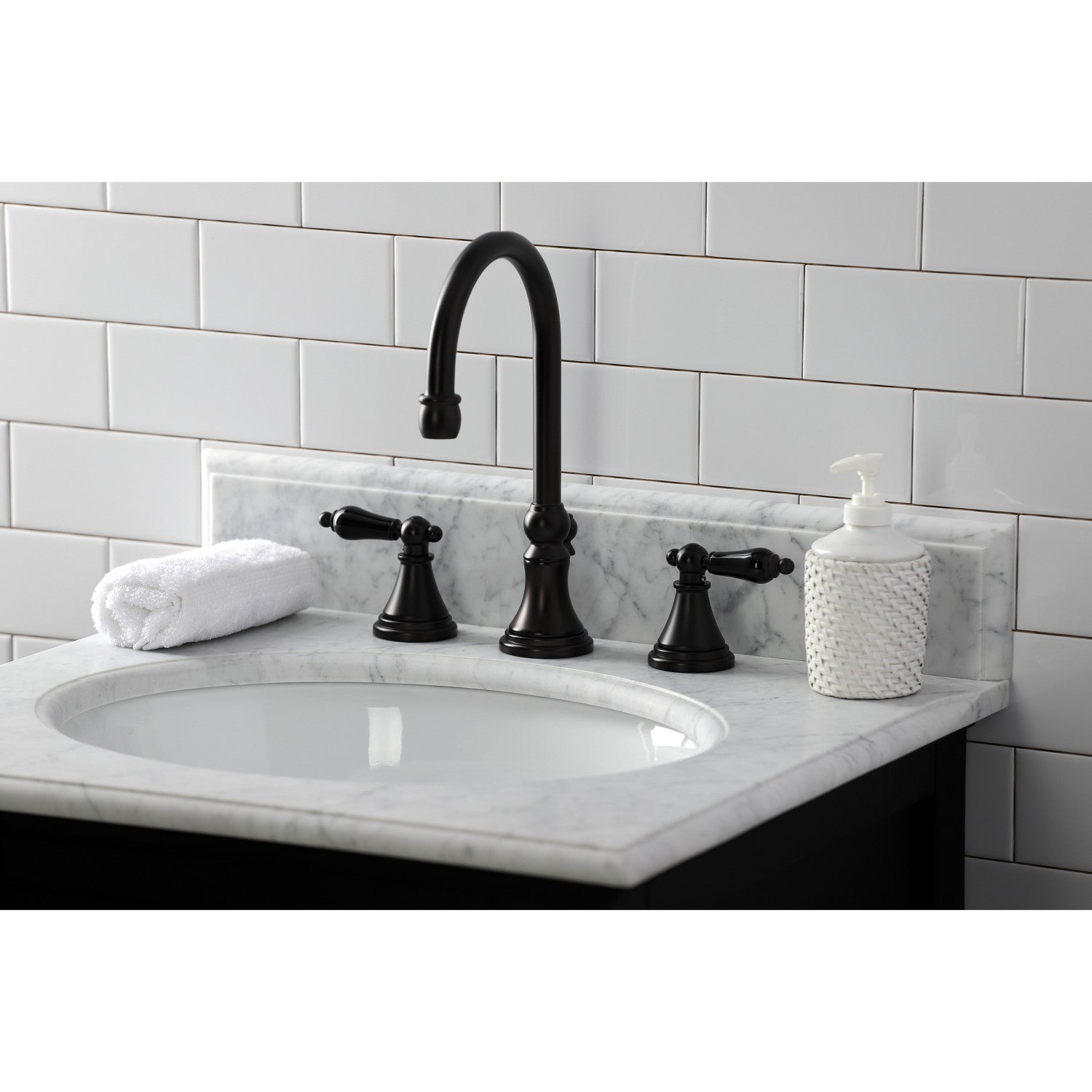 Crafted in commendations to English nobility, the exemplary design of this faucet manifests regality and elegance with its black porcelain handles. Ideal for more spacious bathrooms, widespread faucets are more spread apart and feature a 3-hole installation. The Duchess widespread bathroom faucet with brass pop-up and its featured sturdy brass construction and premium oil rubbed bronze finish are guaranteed to glamorize your home's traditional ensemble for years to come. Glamorize your home today with the traditional elegance of this faucet. A matching finish drain is also included.