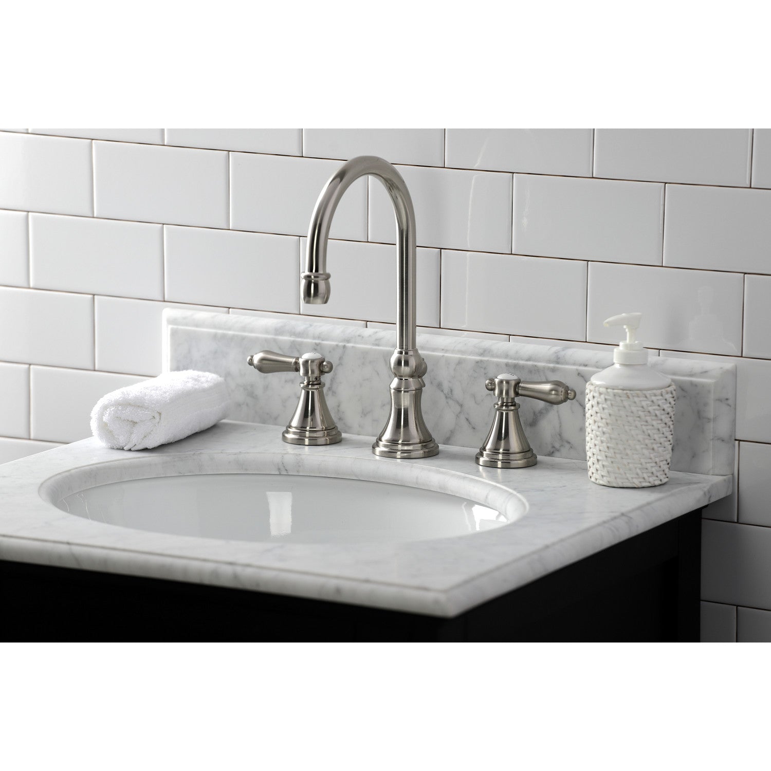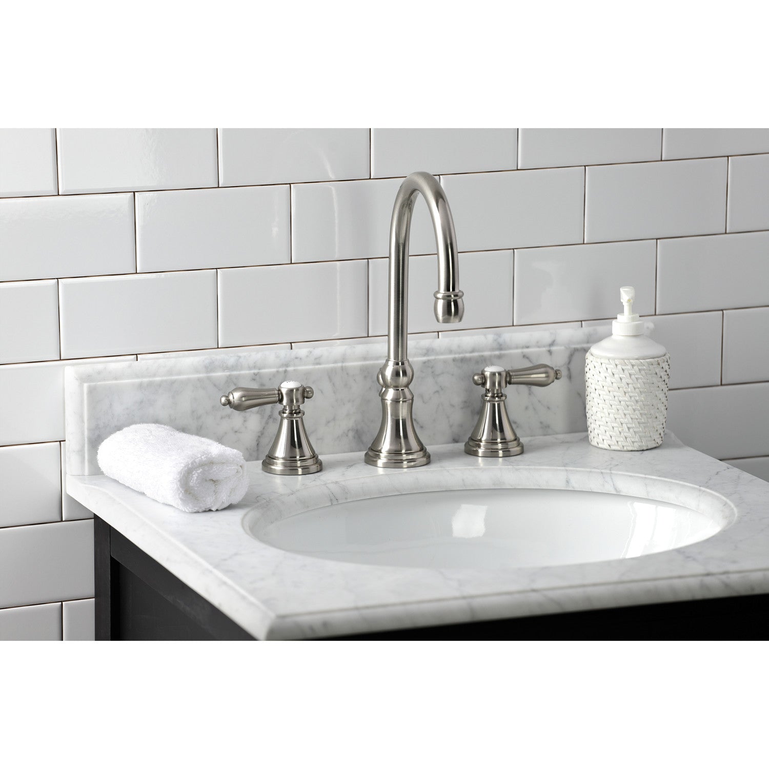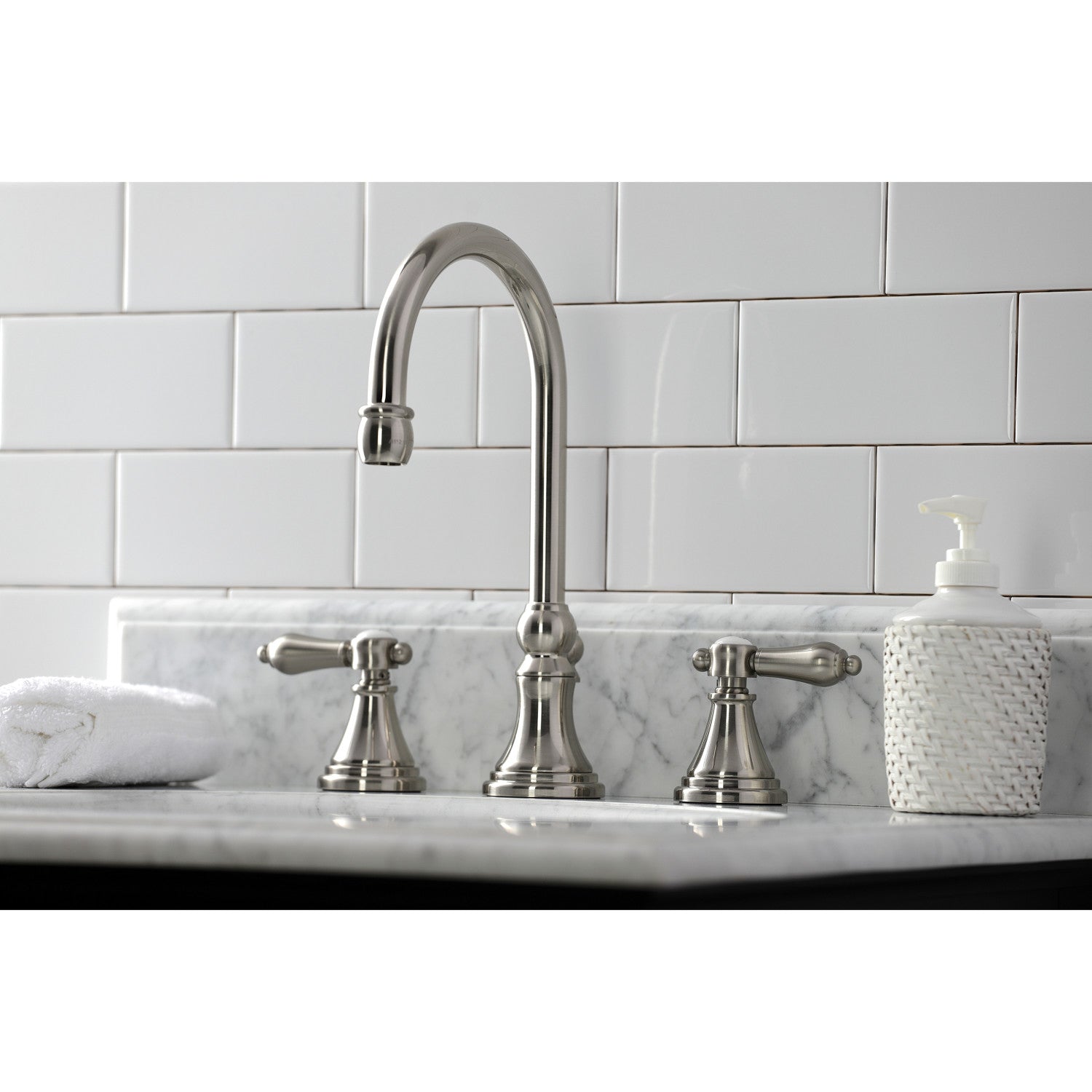 Heirloom KS2988BAL Two-Handle 3-Hole Deck Mount Widespread Bathroom Faucet with Brass Pop-Up, Brushed Nickel