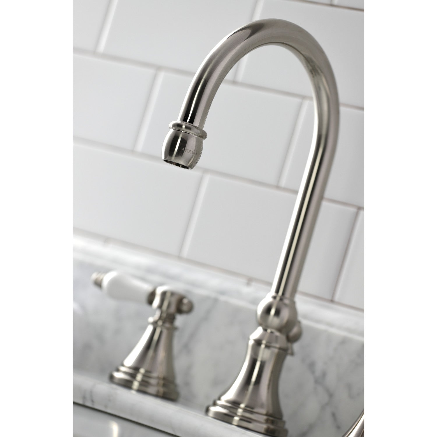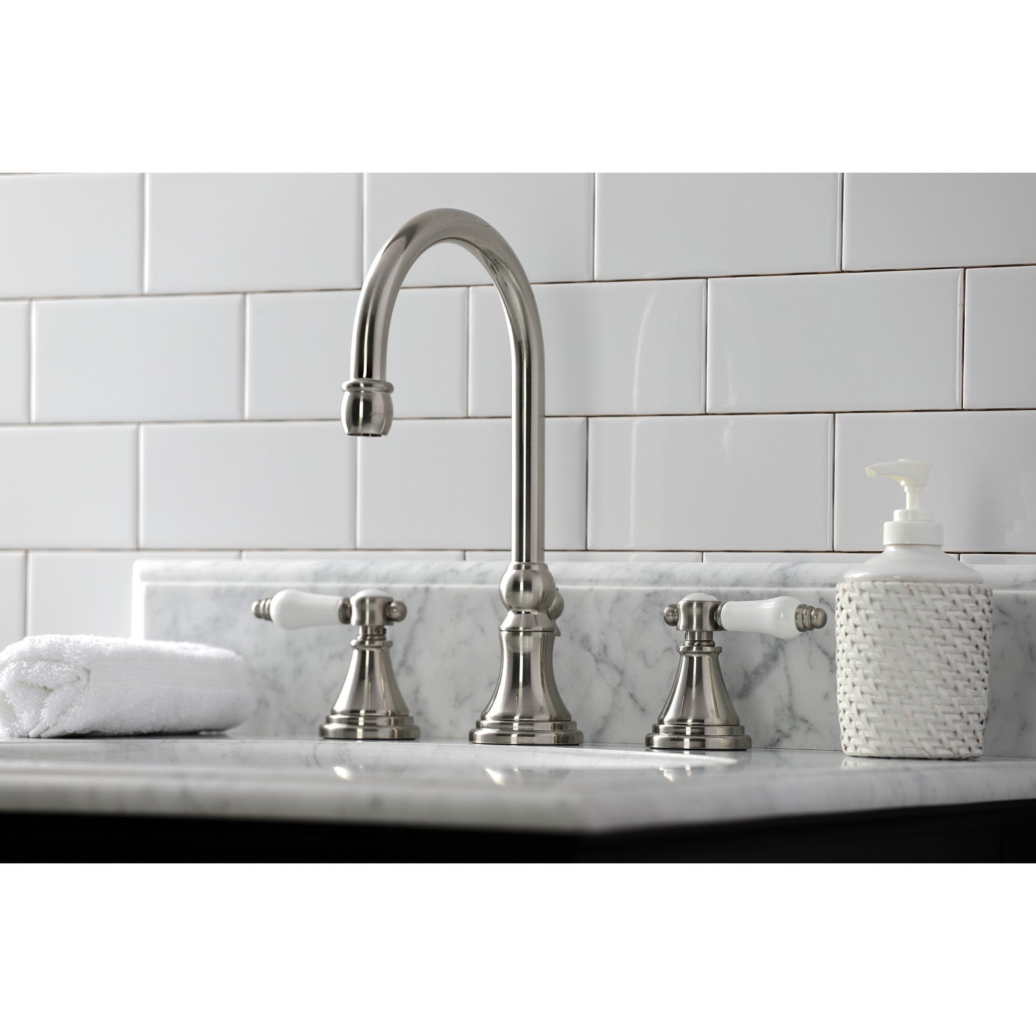 The graceful elegance of timeless design is beautifully merged between British flair and Victorian delicacy within this faucet's white porcelain levers. Ideal for more spacious bathrooms, widespread faucets are more spread apart and feature a 3-hole installation. The Bel-Air widespread bathroom faucet with brass pop-up and its featured sturdy brass construction and premium brushed nickel finish are guaranteed to glamorize your home's traditional ensemble for years to come. Varnish your bathroom with this state-of-the-art fixture. A matching finish drain is also included.