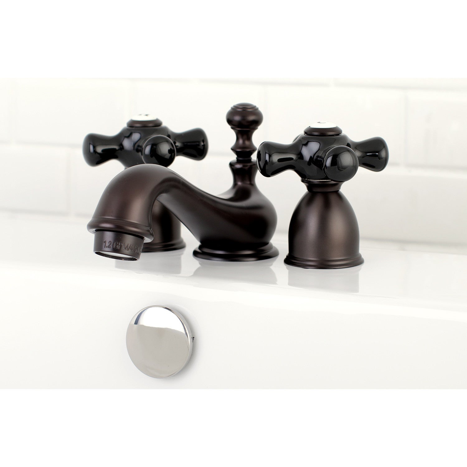 Crafted in commendations to English nobility, the exemplary design of this faucet manifests regality and elegance with its black porcelain handles. Emulating the widespread look, mini-widespread bathroom faucets are for those that love detailed facets and clean lines. These compact faucets provide all of the design elements of a quality faucet without the need for a deck plate in 3-hole sinks. The Duchess mini-widespread bathroom faucet and its featured sturdy brass construction and premium oil rubbed bronze finish are guaranteed to glamorize your home's traditional ensemble for years to come. Glamorize your home today with the traditional elegance of this faucet. A matching finish drain is also included.