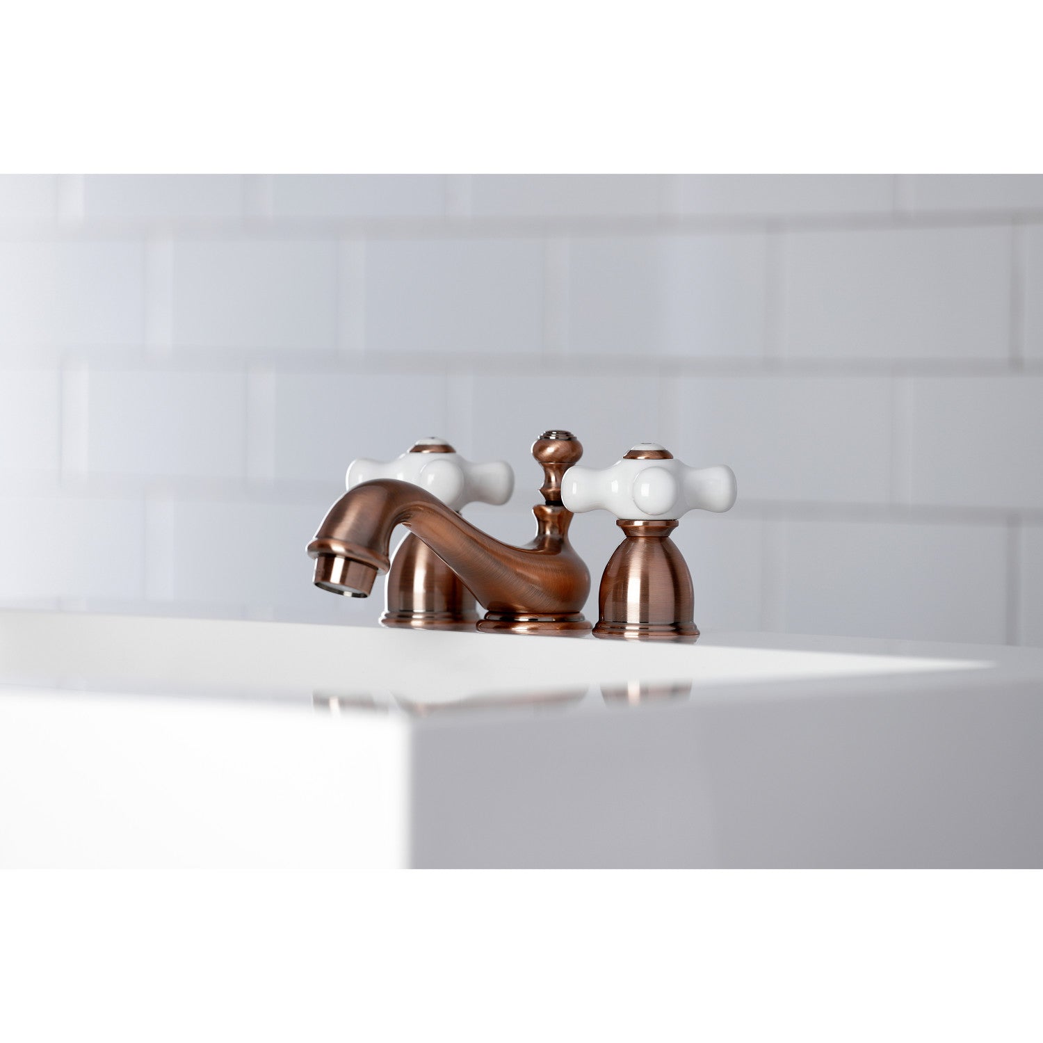 Restoration KS395PXAC Two-Handle 3-Hole Deck Mount Mini-Widespread Bathroom Faucet with Brass Pop-Up, Antique Copper