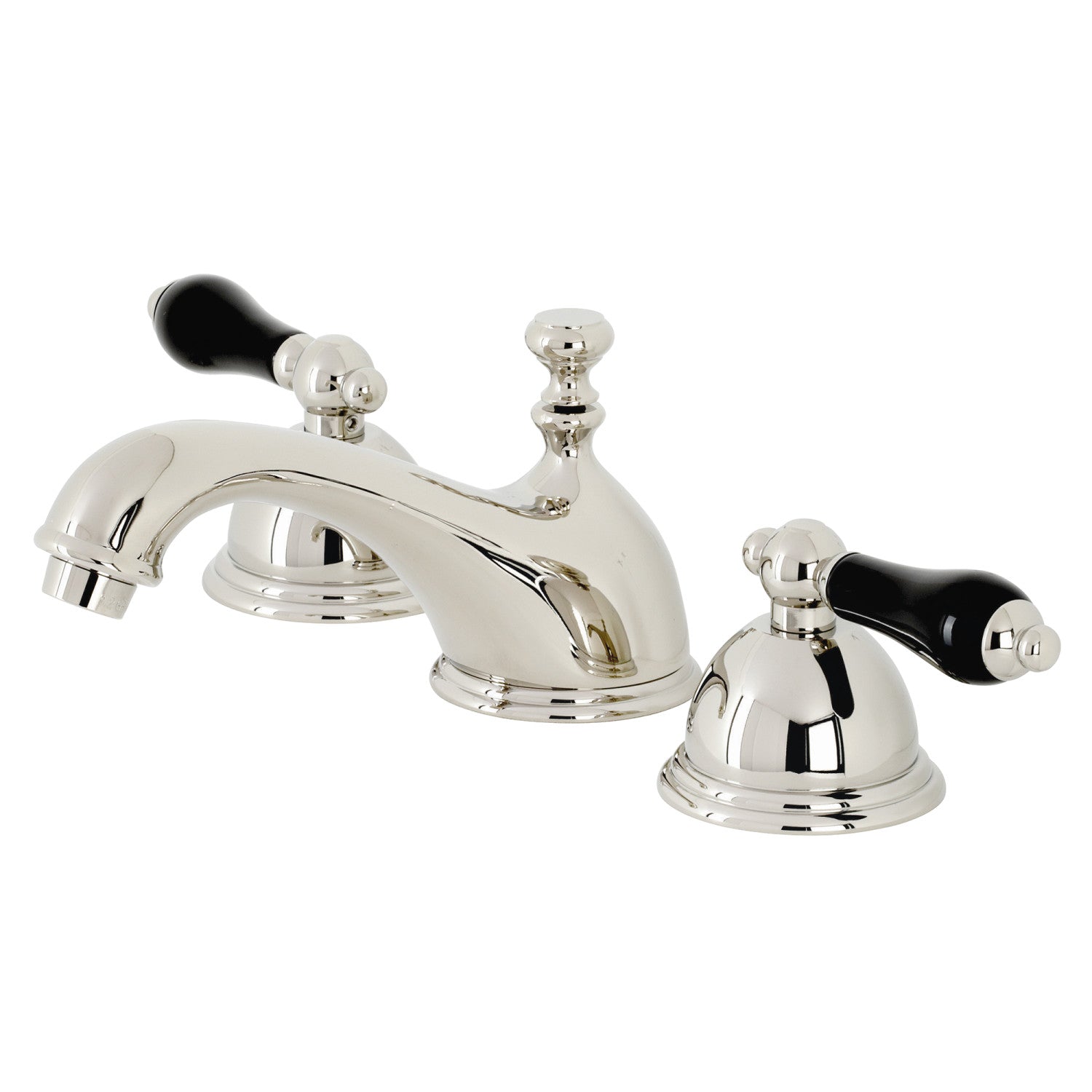 Crafted in commendations to English nobility, the exemplary design of this faucet manifests regality and elegance with its black porcelain handles. Ideal for more spacious bathrooms, widespread faucets are more spread apart and feature a 3-hole installation. The Duchess widespread bathroom faucet with brass pop-up and its featured sturdy brass construction and premium polished nickel finish are guaranteed to glamorize your home's traditional ensemble for years to come. Glamorize your home today with the traditional elegance of this faucet. A matching finish drain is also included.
