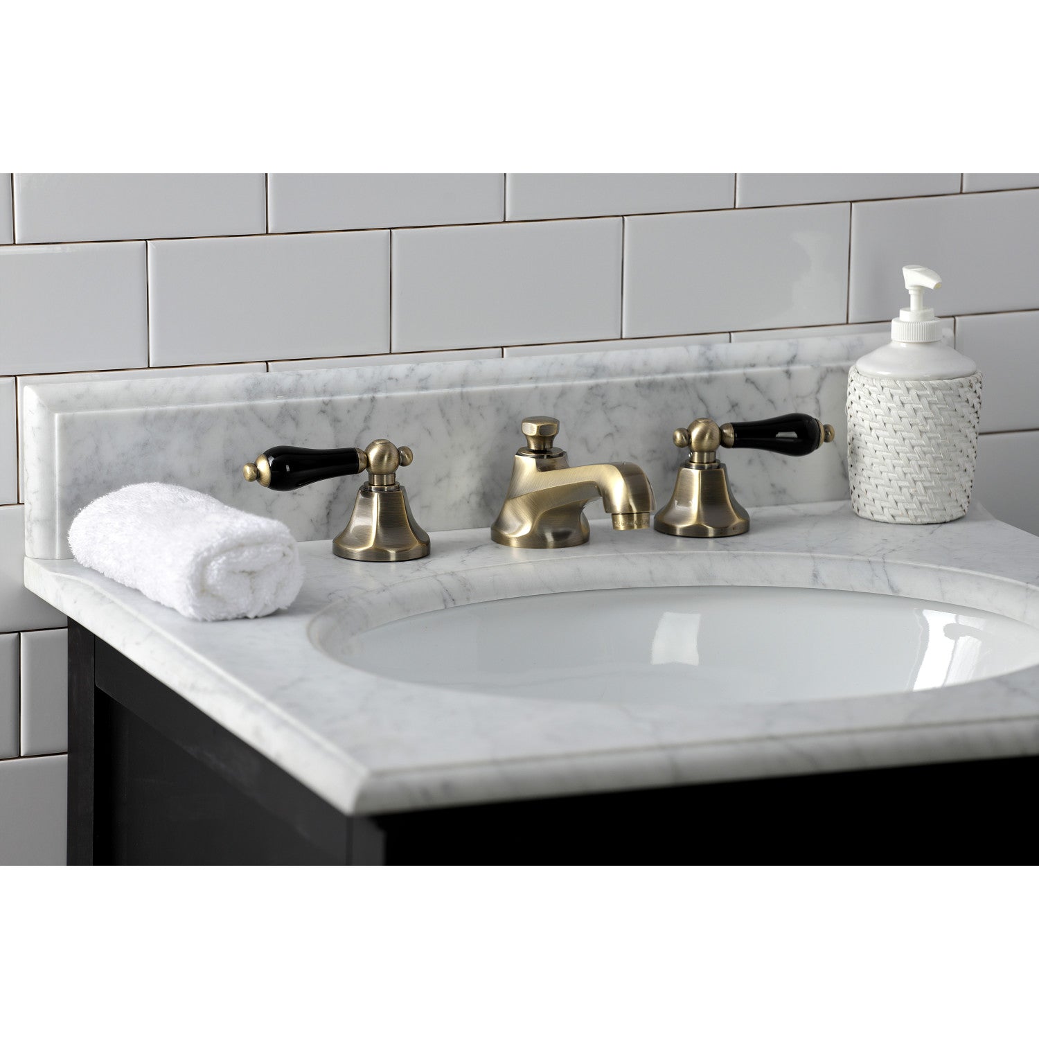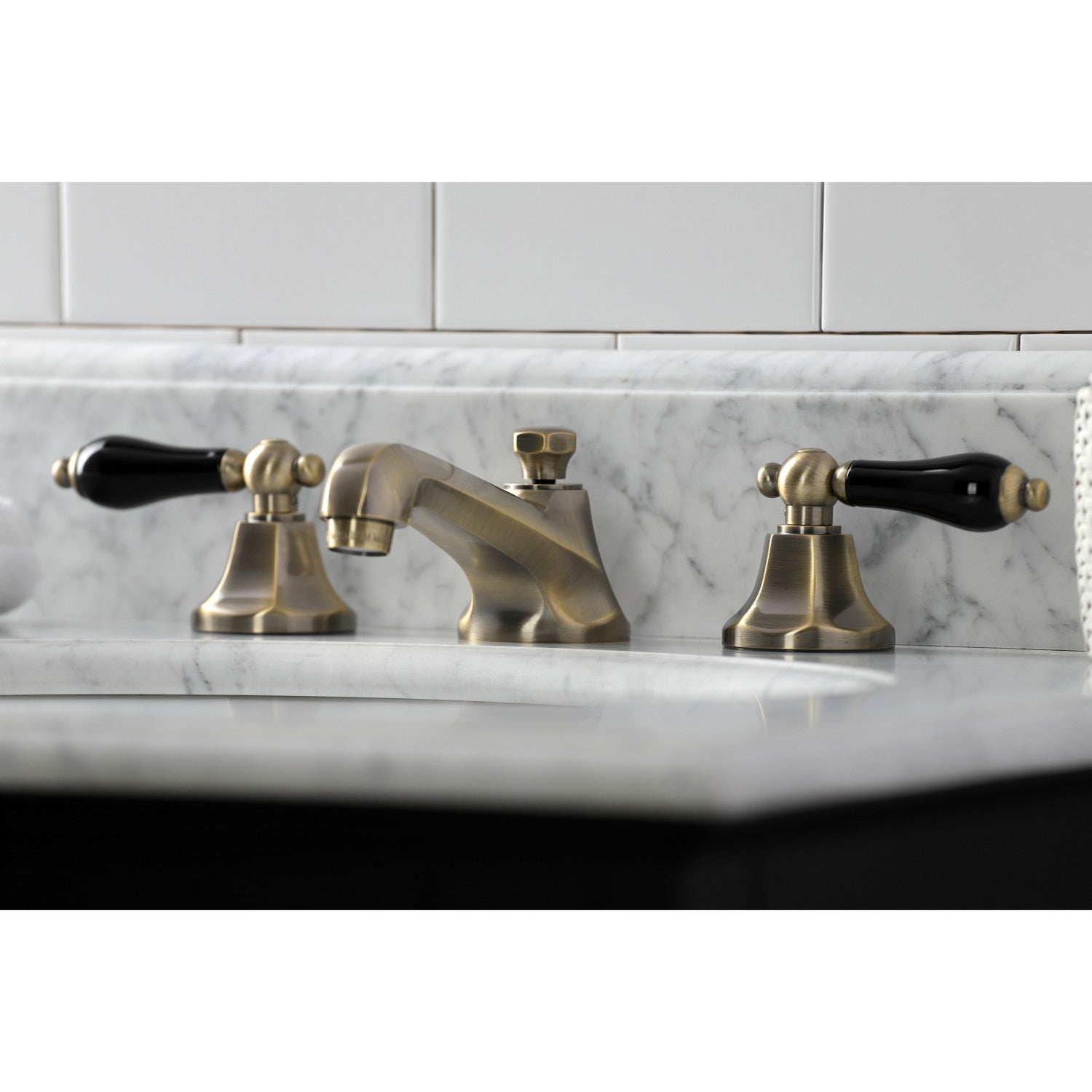 Crafted in commendations to English nobility, the exemplary design of this faucet manifests regality and elegance with its black porcelain handles. Ideal for more spacious bathrooms, widespread faucets are more spread apart and feature a 3-hole installation. The Duchess widespread bathroom faucet with brass pop-up and its featured sturdy brass construction and premium antique brass finish are guaranteed to glamorize your home's modern ensemble for years to come. Glamorize your home today with the traditional elegance of this faucet. A matching finish drain is also included.
