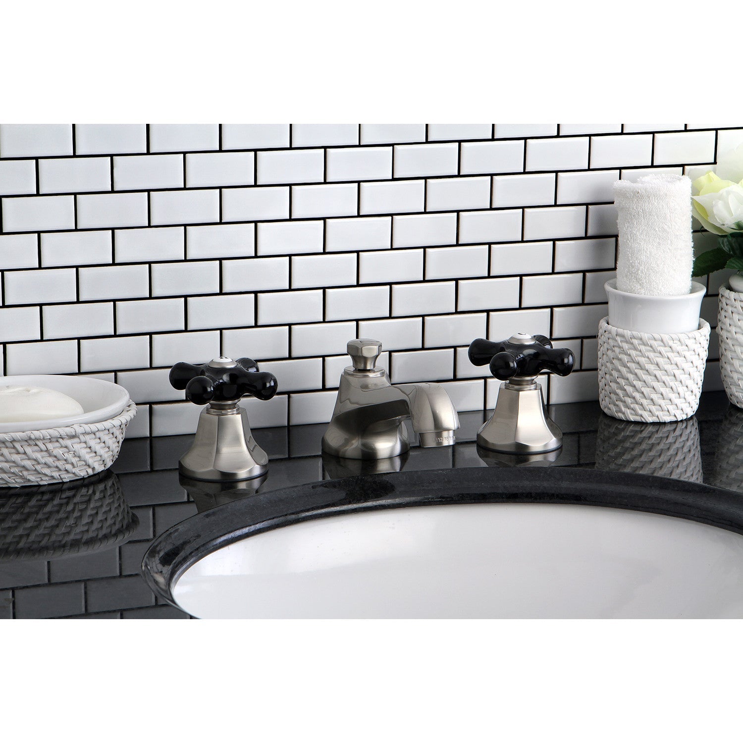 Crafted in commendations to English nobility, the exemplary design of this faucet manifests regality and elegance with its black porcelain handles. Ideal for more spacious bathrooms, widespread faucets are more spread apart and feature a 3-hole installation. The Duchess 8-inch widespread bathroom faucet with brass pop-up and its featured sturdy brass construction and premium brushed nickel finish are guaranteed to glamorize your home's modern ensemble for years to come. Glamorize your home today with the traditional elegance of this faucet. A matching finish drain is also included.
