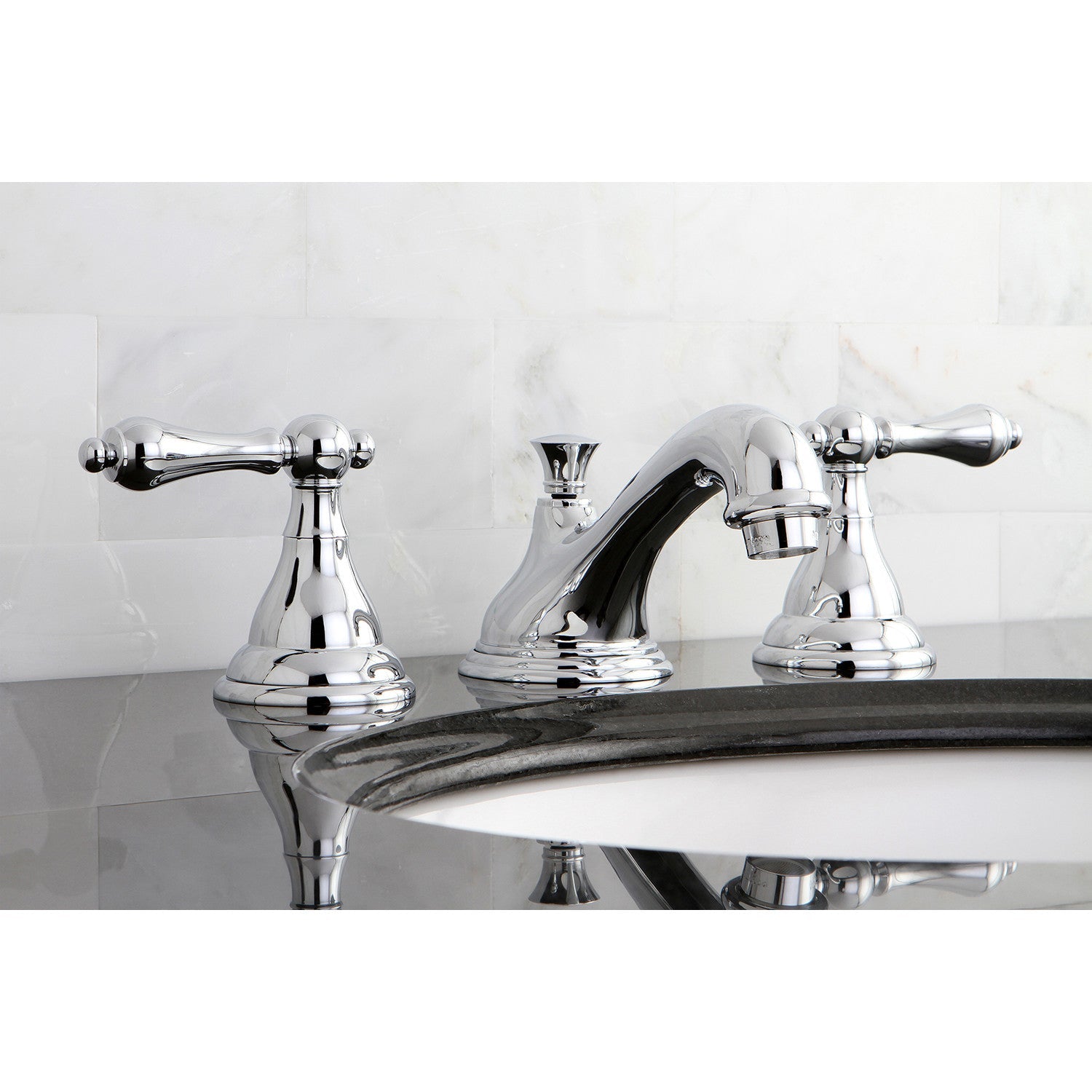 The exquisite design of this faucet tastefully flatters the elegant architecture of traditional homes with its fine detailing. Ideal for more spacious bathrooms, widespread faucets are more spread apart and feature a 3-hole installation. The Kingston Brass 8-inch widespread bathroom faucet with brass pop-up and its featured sturdy brass construction and premium polished chrome finish are guaranteed to glamorize your home's traditional ensemble for years to come. A matching finish drain is also included.