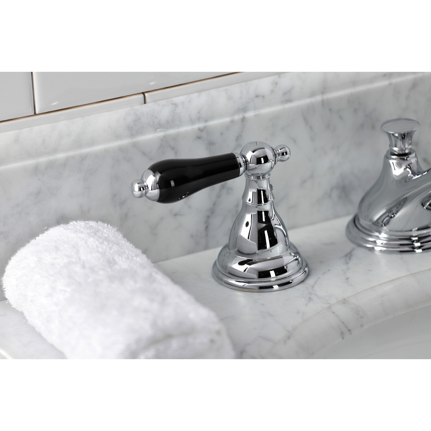 Crafted in commendations to English nobility, the exemplary design of this faucet manifests regality and elegance with its black porcelain handles. Ideal for more spacious bathrooms, widespread faucets are more spread apart and feature a 3-hole installation. The Duchess widespread bathroom faucet with brass pop-up and its featured sturdy brass construction and premium polished chrome finish are guaranteed to glamorize your home's traditional ensemble for years to come. Glamorize your home today with the traditional elegance of this faucet. A matching finish drain is also included.