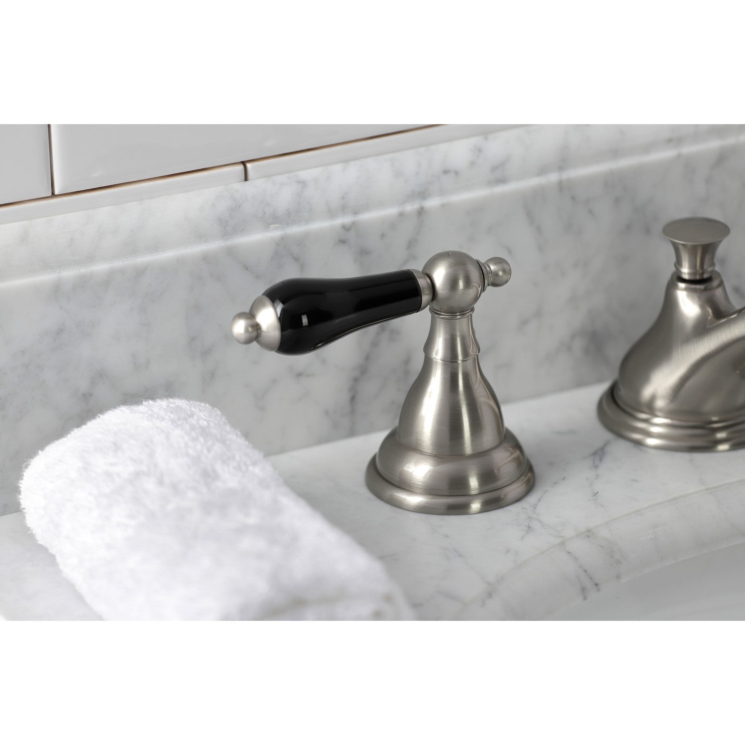 Crafted in commendations to English nobility, the exemplary design of this faucet manifests regality and elegance with its black porcelain handles. Ideal for more spacious bathrooms, widespread faucets are more spread apart and feature a 3-hole installation. The Duchess widespread bathroom faucet with brass pop-up and its featured sturdy brass construction and premium brushed nickel finish are guaranteed to glamorize your home's traditional ensemble for years to come. Glamorize your home today with the traditional elegance of this faucet. A matching finish drain is also included.