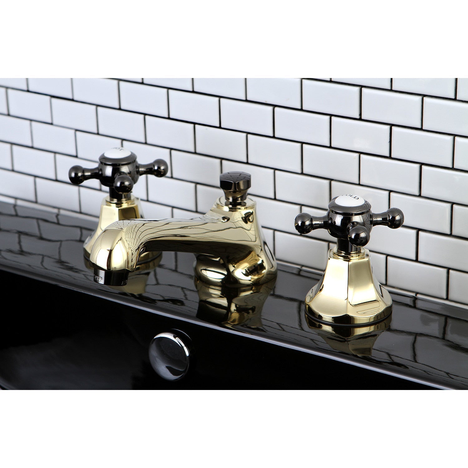 Water Onyx NS4466BX Two-Handle 3-Hole Deck Mount Widespread Bathroom Faucet with Brass Pop-Up, Polished Brass/Black Stainless Steel