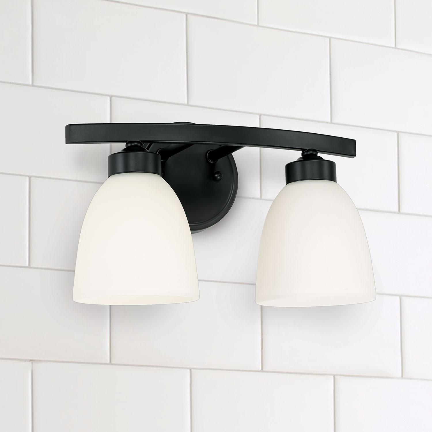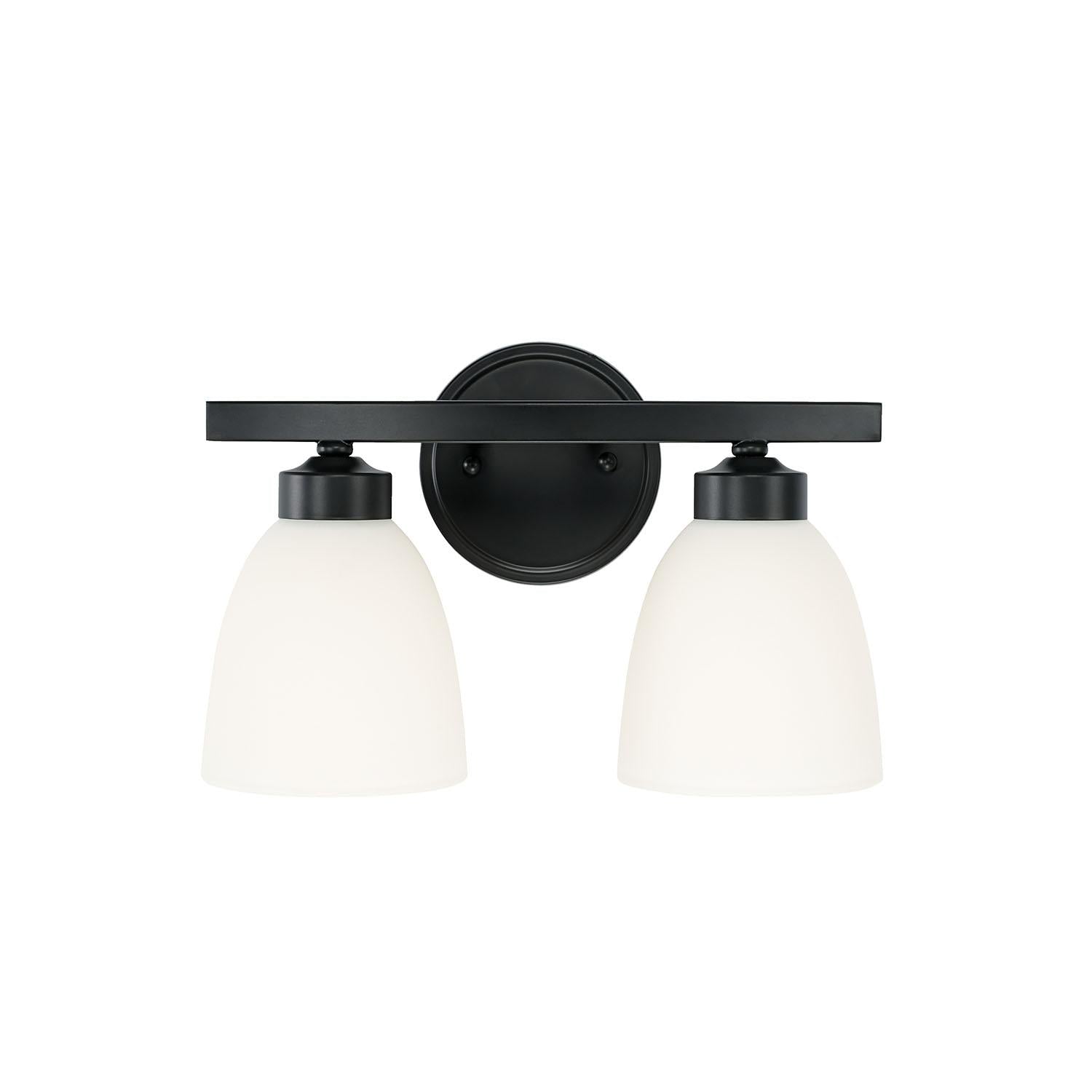 Clean lines and Sleek silhouettes create the Jameson 2-Light Vanity for HomePlace. The soft white glass complements the Matte Black finish for a contemporary update to the transitional look.