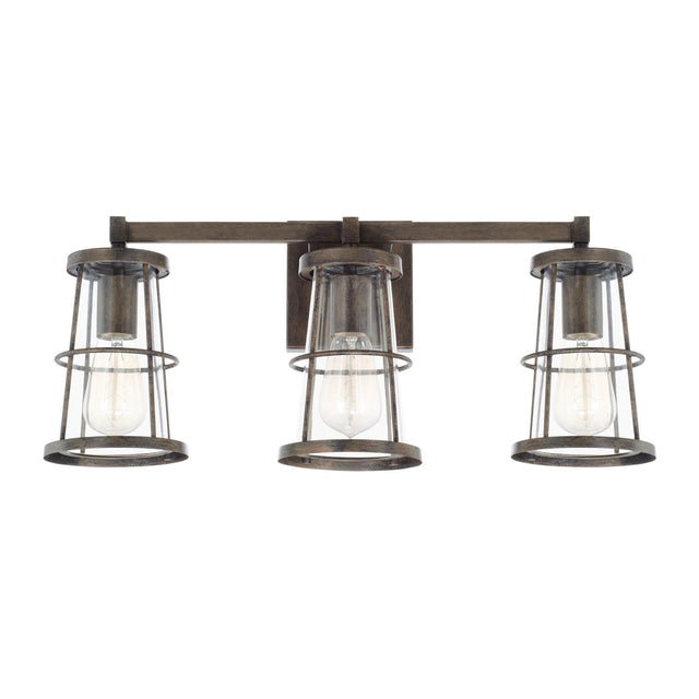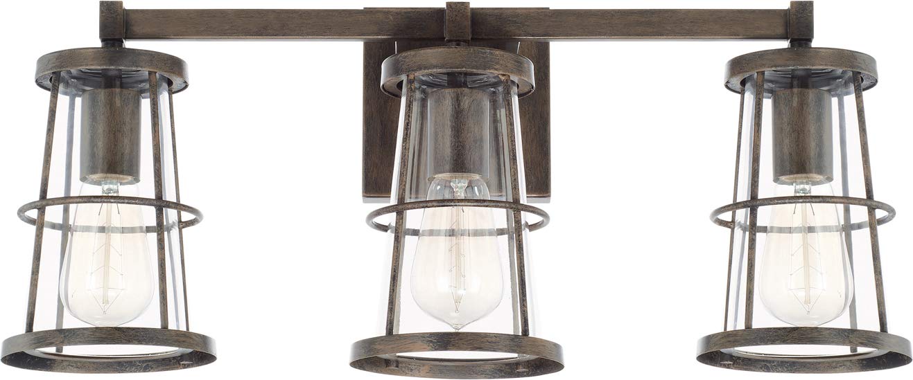 The Beaufort 3-light vanity in a rich Nordic Grey finish bathes your vanity mirror in farmhouse style. Clear tapered glass shades encased in cage-like frames cast a multidirectional glow making morning and evening beauty routines easier and the ambience brighter.