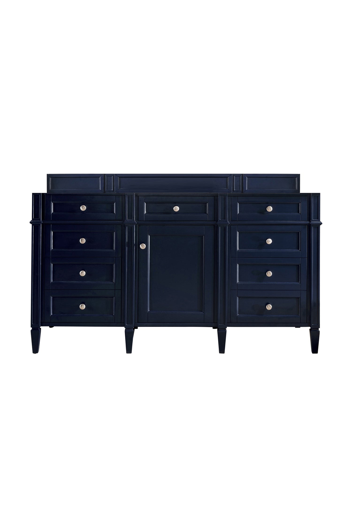 The Victory Blue finish on the 60" Brittany Single Vanity features optimal organization with one hide-away tip-out drawer plus six side drawers, two of which are double height for storing taller items. This cabinet also has one door, which conceals an interior shelf. All drawers are lined with an aluminum laminate surface for easy cleaning and are equipped with undermount soft-close slides. All of our 3cm tops include a porcelain undermount sink. Includes decorative backsplash for added style.