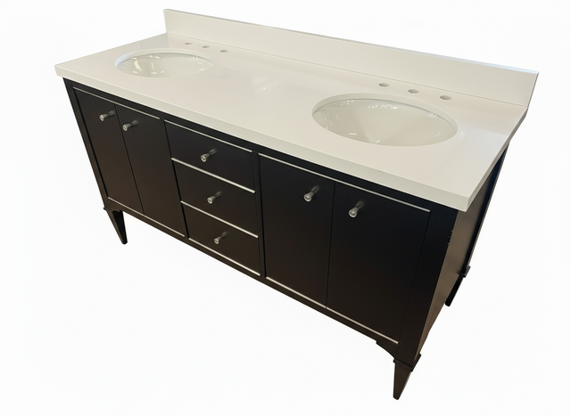 Experience refined elegance with the Fairmont Designs Charlottesville 60″ Double Vanity Suite, a floor model showcasing sophisticated bathroom design. Featuring a vintage black finish with graceful tapered legs and solid hardwood construction, this statement piece pairs beautifully with a Pure White Quartz countertop that resists stains and requires minimal upkeep. The pre-installed double undermount sinks offer seamless functionality and a polished aesthetic. Measuring 60″ W × 21.5″ D × 36″ H, this fully assembled vanity arrives ready for installation, delivering designer-quality craftsmanship at an exceptional value.
