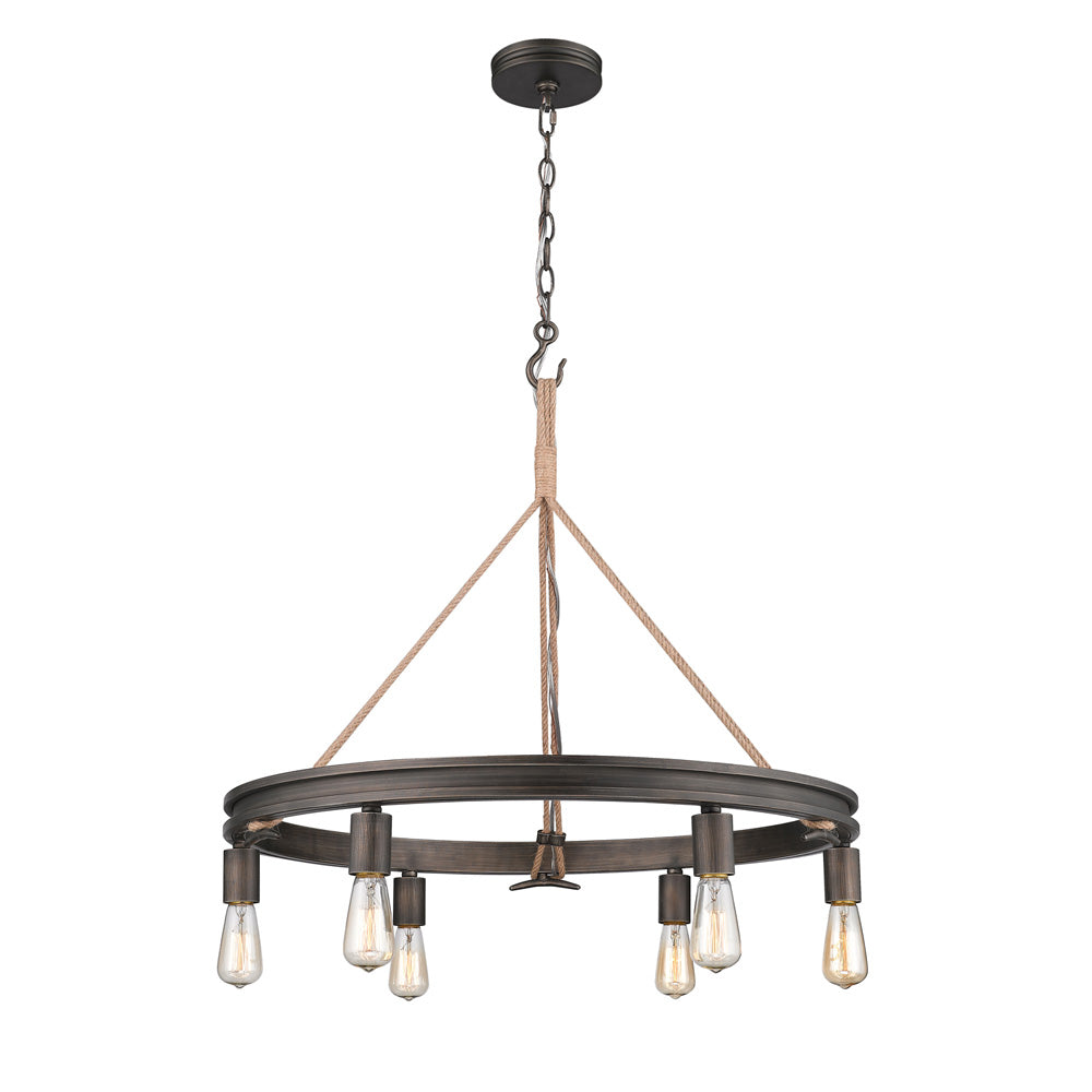 Inspired by the sea, this coastal collection features a simple design with authentic, nautical details. Tied in sailor's knots, woven ropes loop metal cleats before being suspended from maritime hooks. The contrast between the available finish options and texture of the rope and metalwork creates visual interest. Created to be hung with the lamps facing up or down, the transitional fixtures are versatile. This look is perfect for seaside retreats, casual lofts, and rustic bungalows. This 6-light chandelier is comfortably sized for intimate dining and living areas.